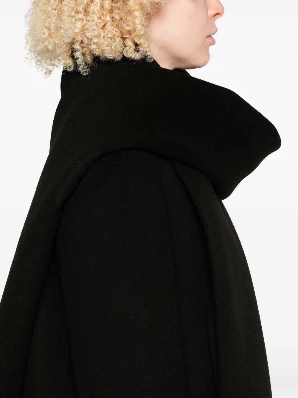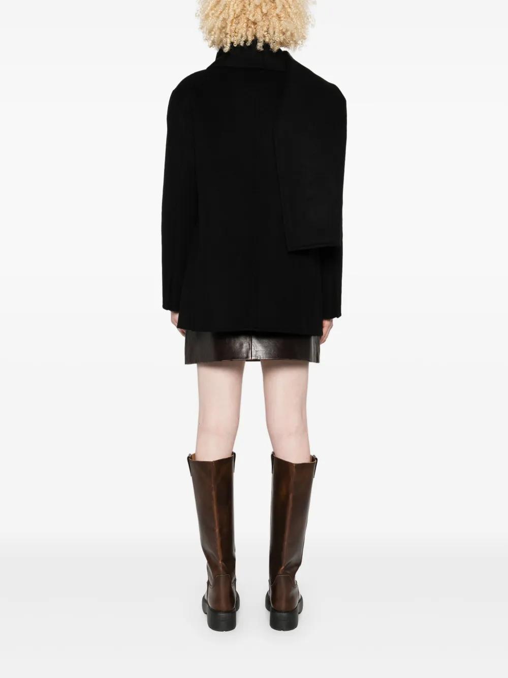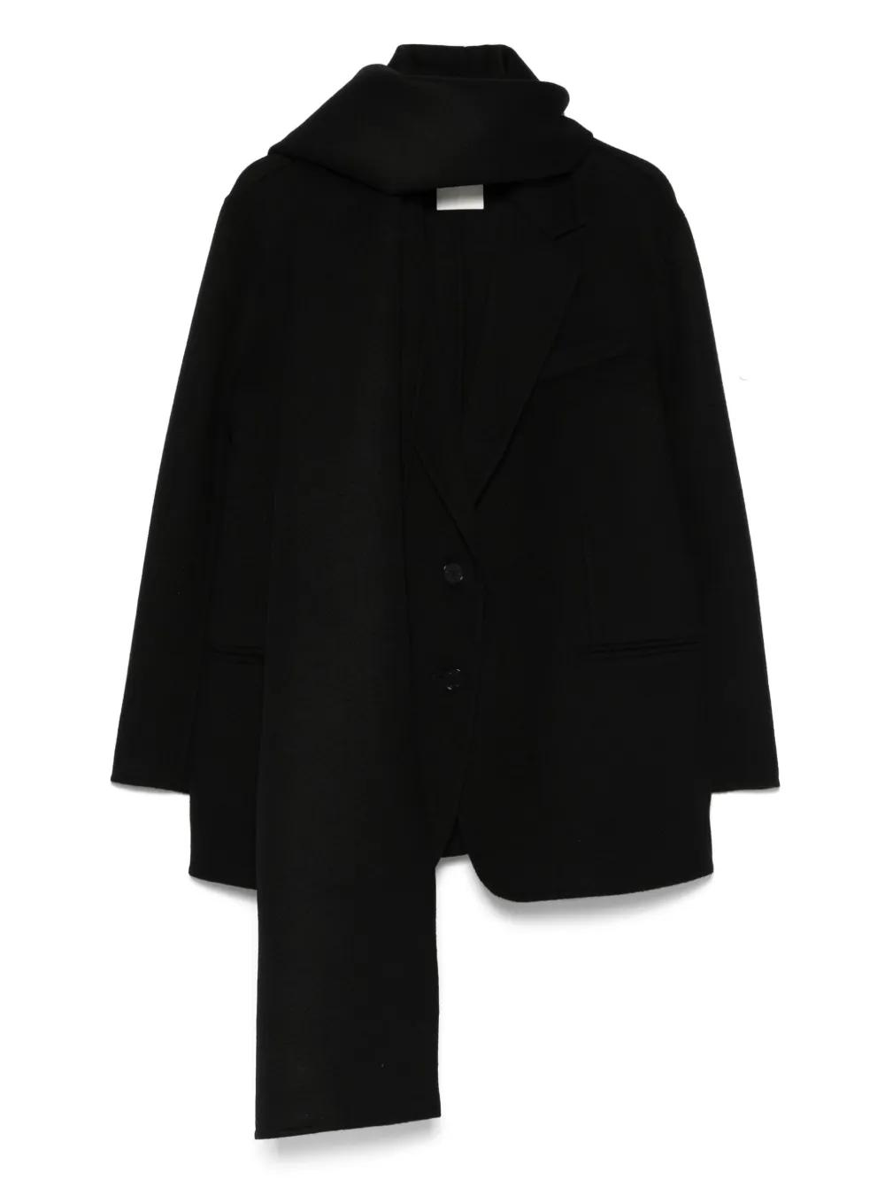 black front button fastening chest welt pocket two front jetted pockets attached scarf