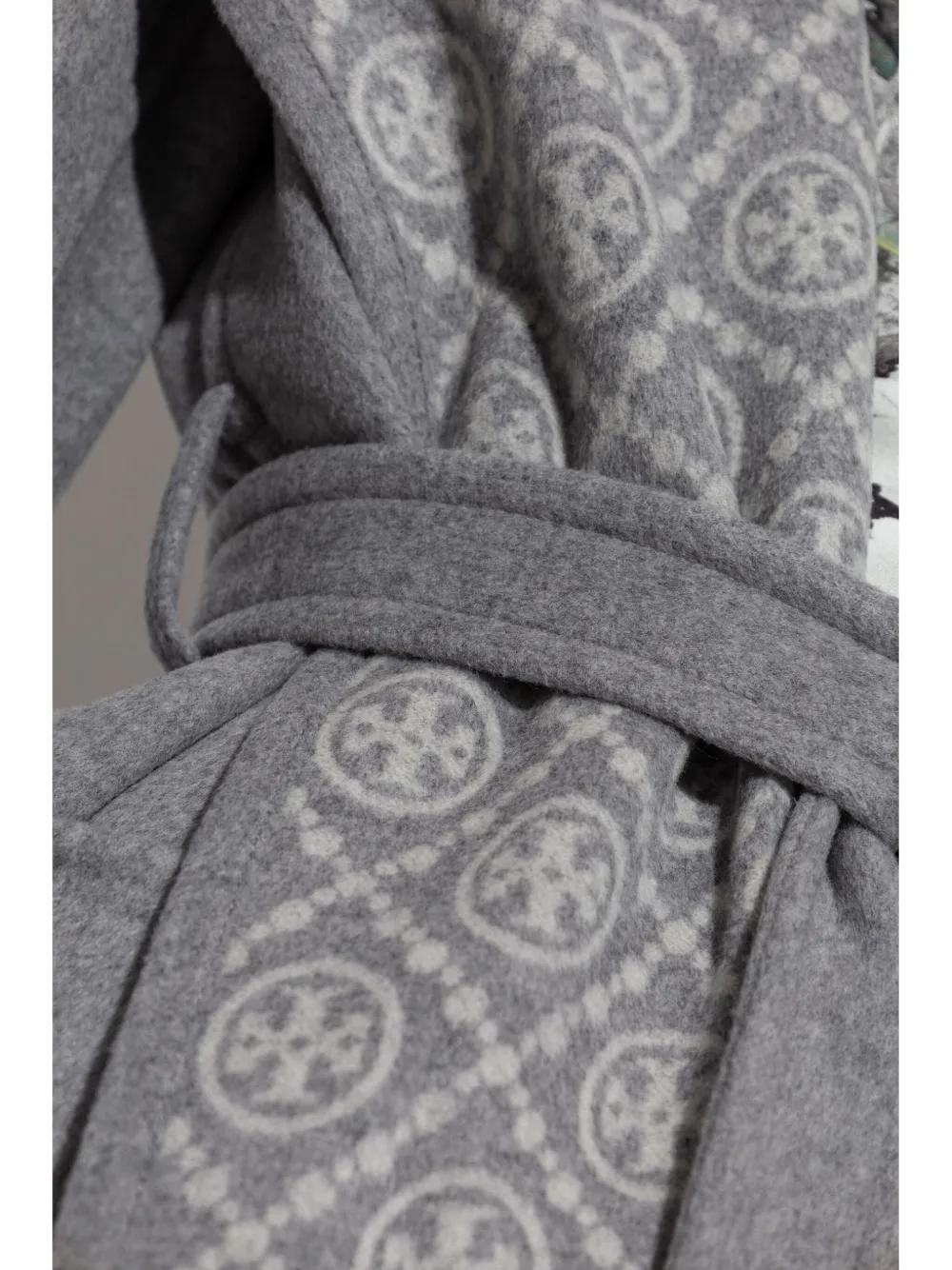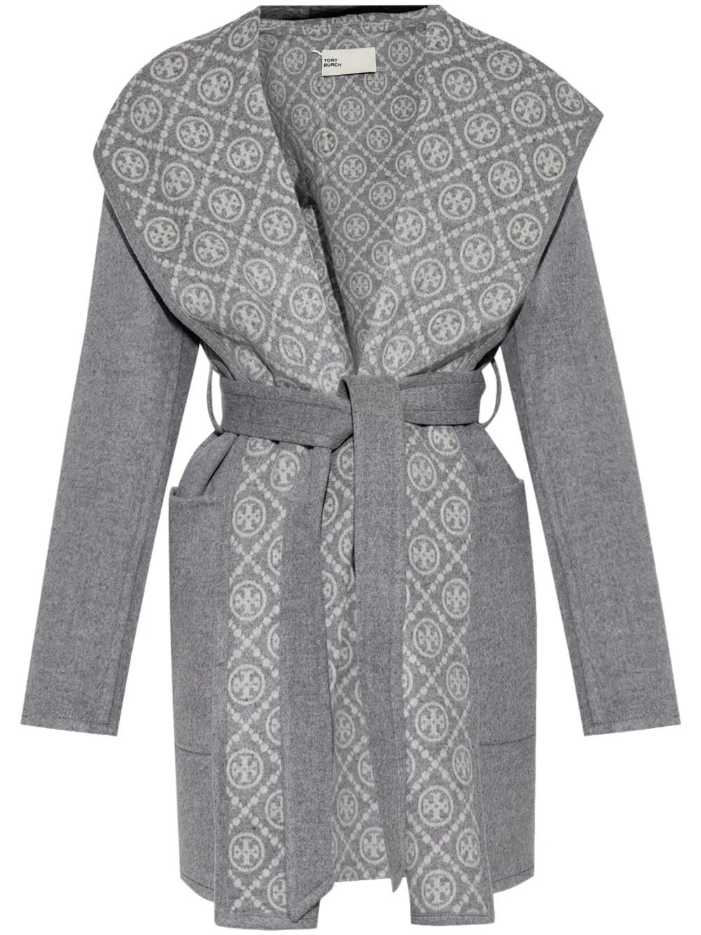 medium grey wool knitted construction logo-jacquard lining detachable and adjustable waist belt slouchy hood shawl lapels belt loops two front patch pockets long sleeves straight hem thigh-length