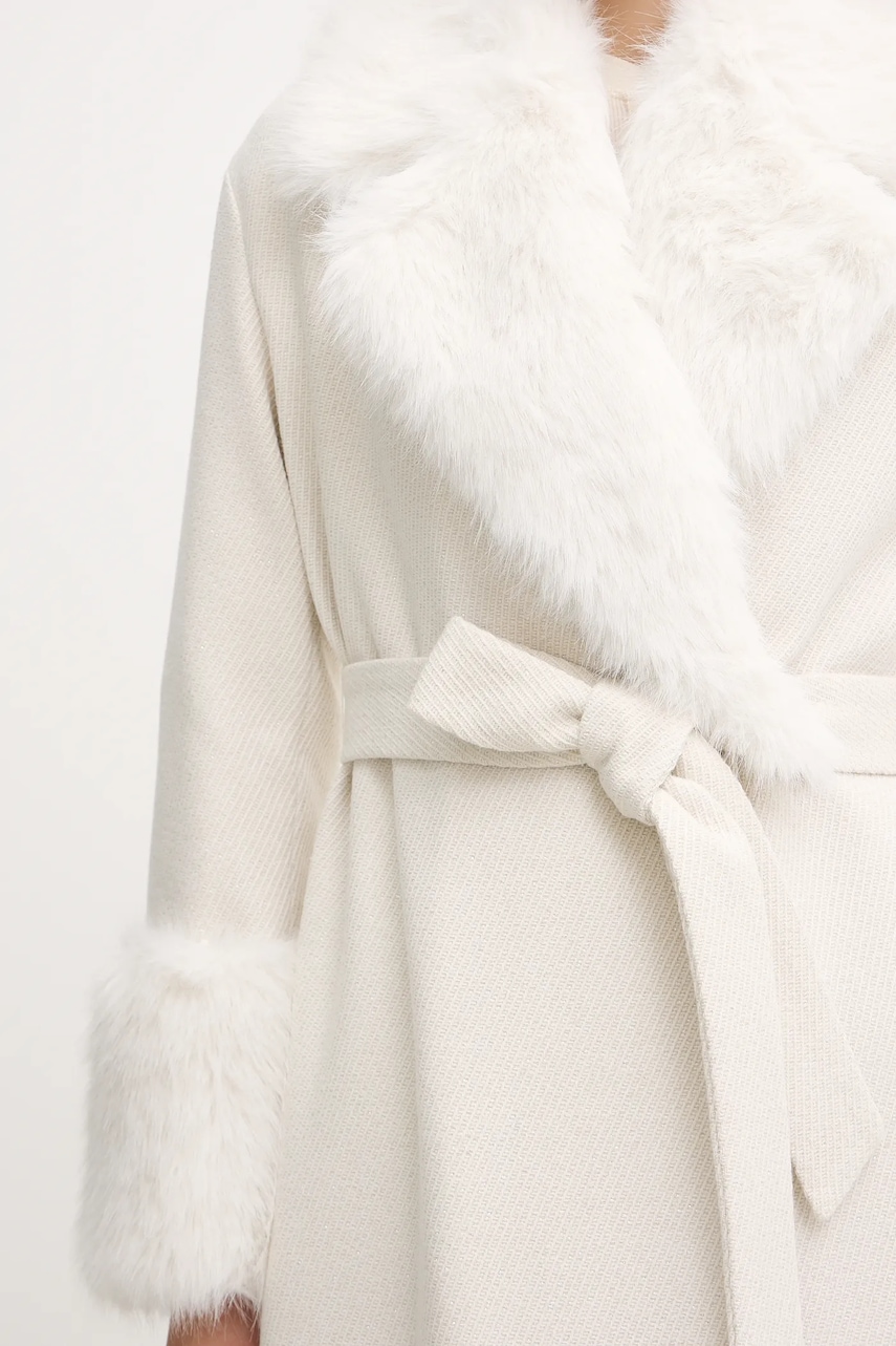 - Prosty, nie blokujący ruchów fason. - Model z odpinanym, sztucznym futerkiem. - Klasyczne klapy. - Dwurzędowe zapięcie na guziki. - Dwie wsuwane kieszenie boczne. - W talii pasek, który modeluje sylwetkę i dodatkowo podkreśla talię. - Lekko ocieplony model na podszewce. - Z tyłu rozcięcie, które zapewnia swobodę podczas poruszania się oraz lepsze układanie się materiału. - Długość rękawa: 63 cm. - Długość: 121 cm. - Szerokość pod pachami: 54 cm. - Wymiary podane dla rozmiaru: 36.