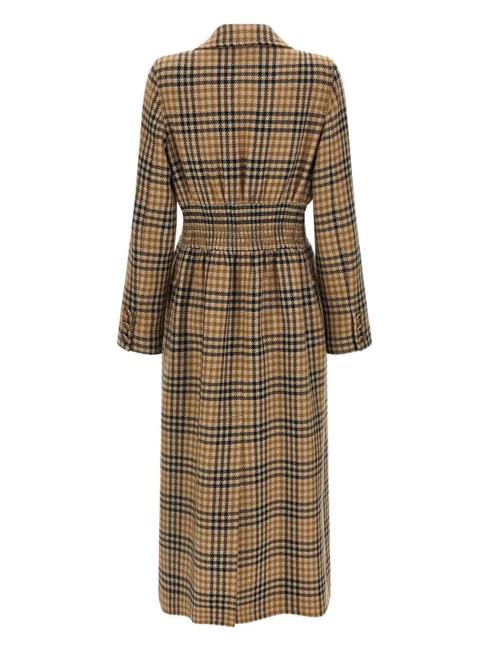 brown houndstooth pattern double-breasted lapel collar flap pockets smock stitch at the waist