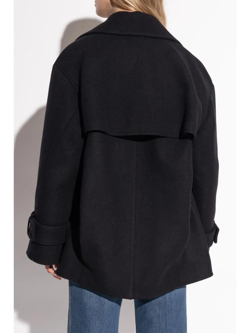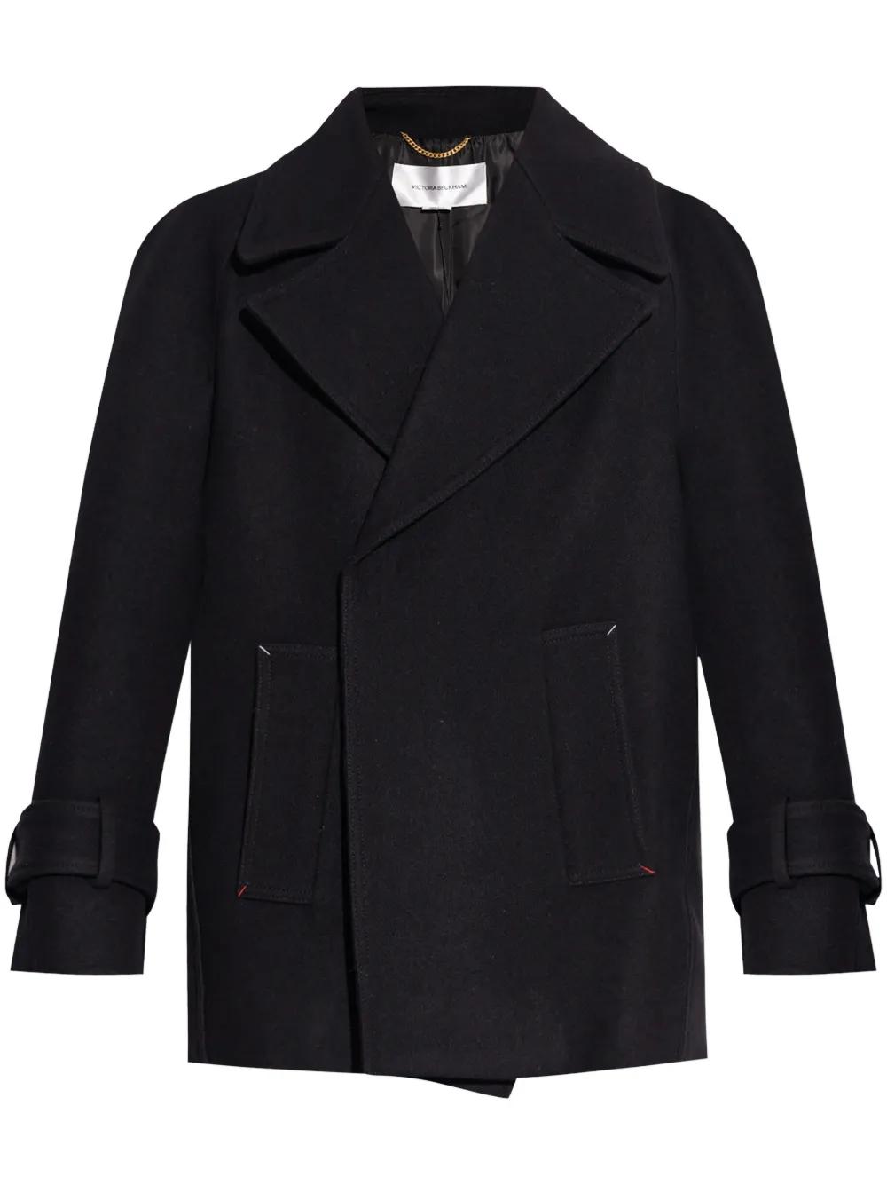 black wool double-breasted button fastening two side slit pockets peak lapels long sleeves
