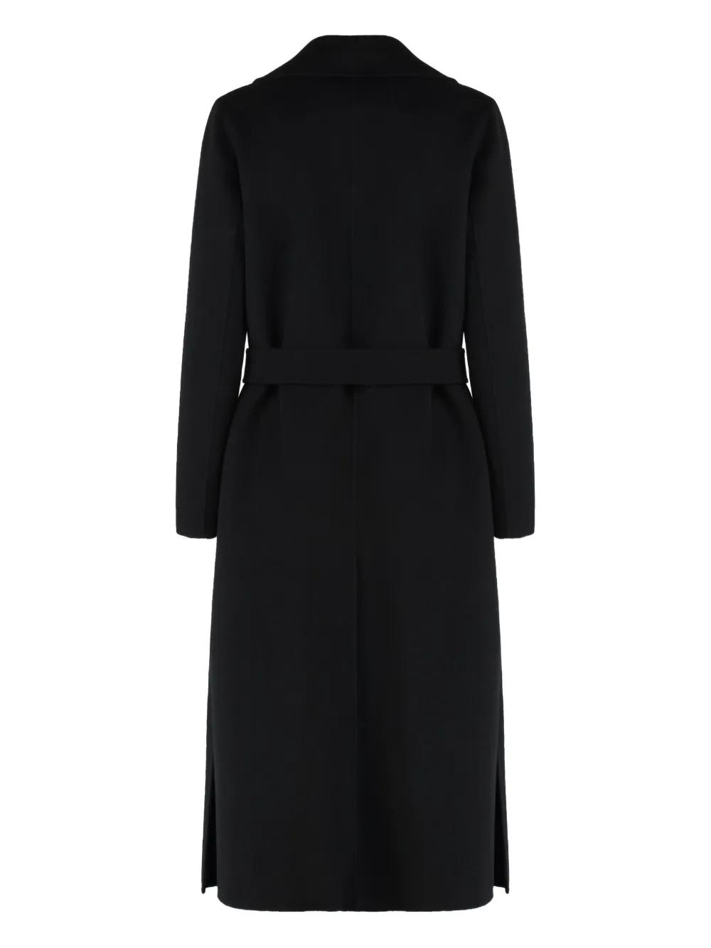 black wide lapels coordinated waist belt back slit hem virgin wool double-breasted fastening