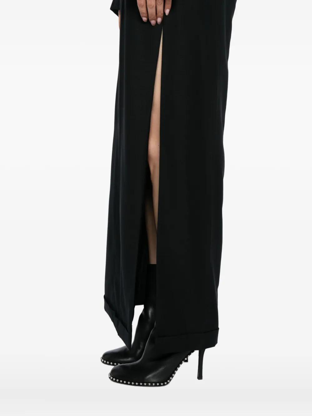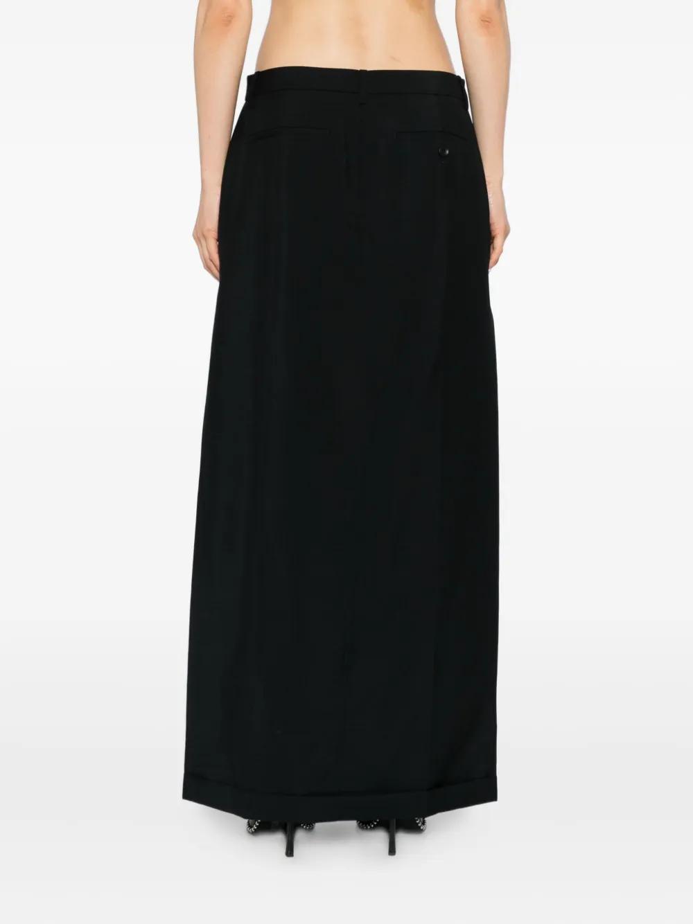 black front button and zip fastening two side slash pockets two rear welt pockets side slit