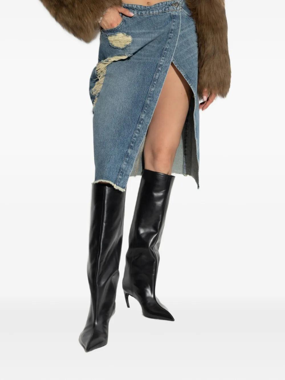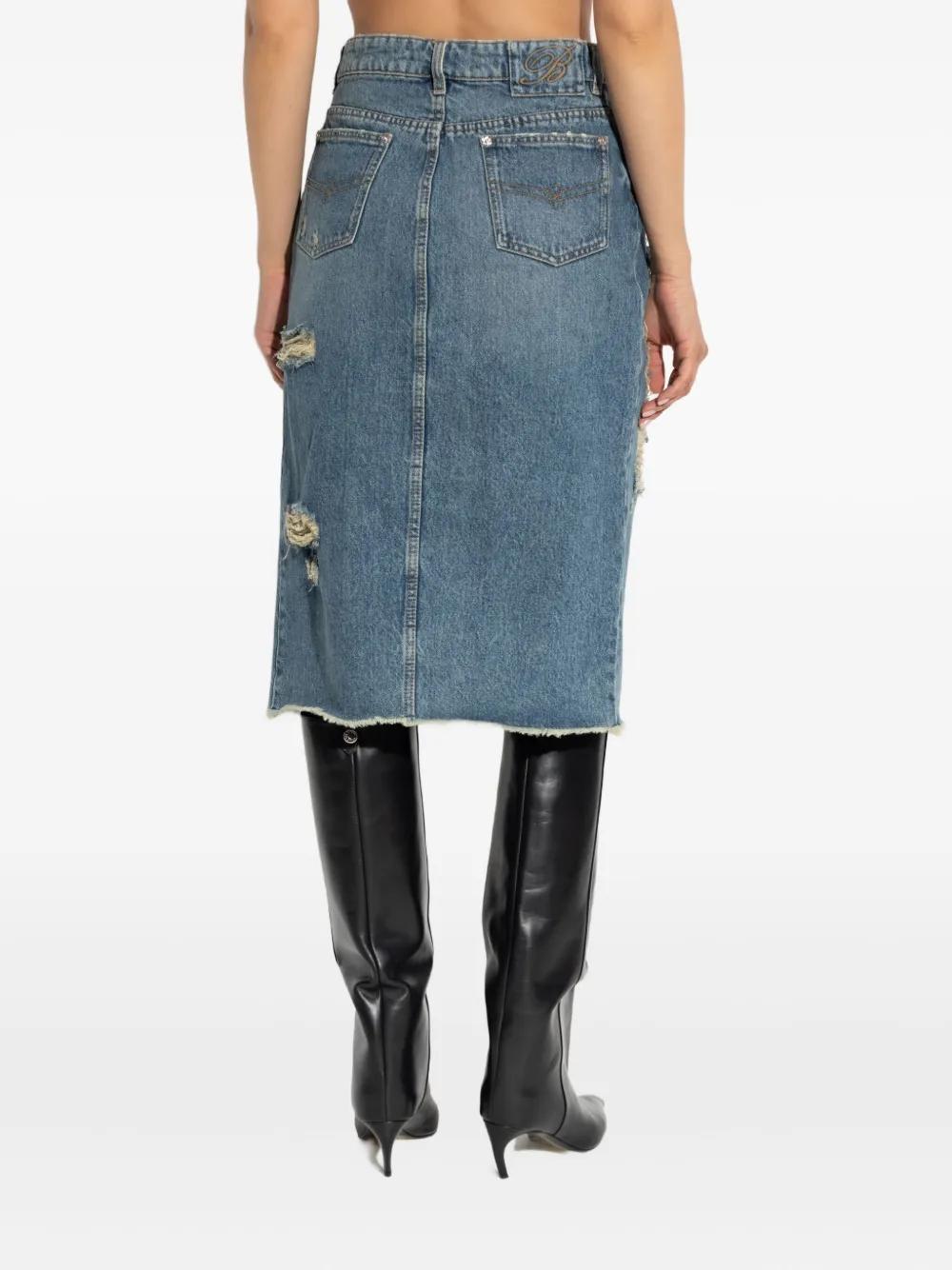light blue distressed denim asymmetrical hem front slit wrap-around design embroidered logo patch
