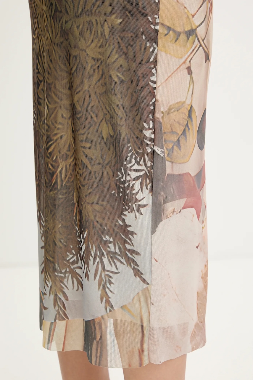 - Model o długości midi. - Model wykonany z transparentnej siateczki. - Model z nadrukiem. - Model na podszewce. - Długość: 80 cm. - Szerokość w pasie: 35 cm. - Wymiary podane dla rozmiaru: S.
