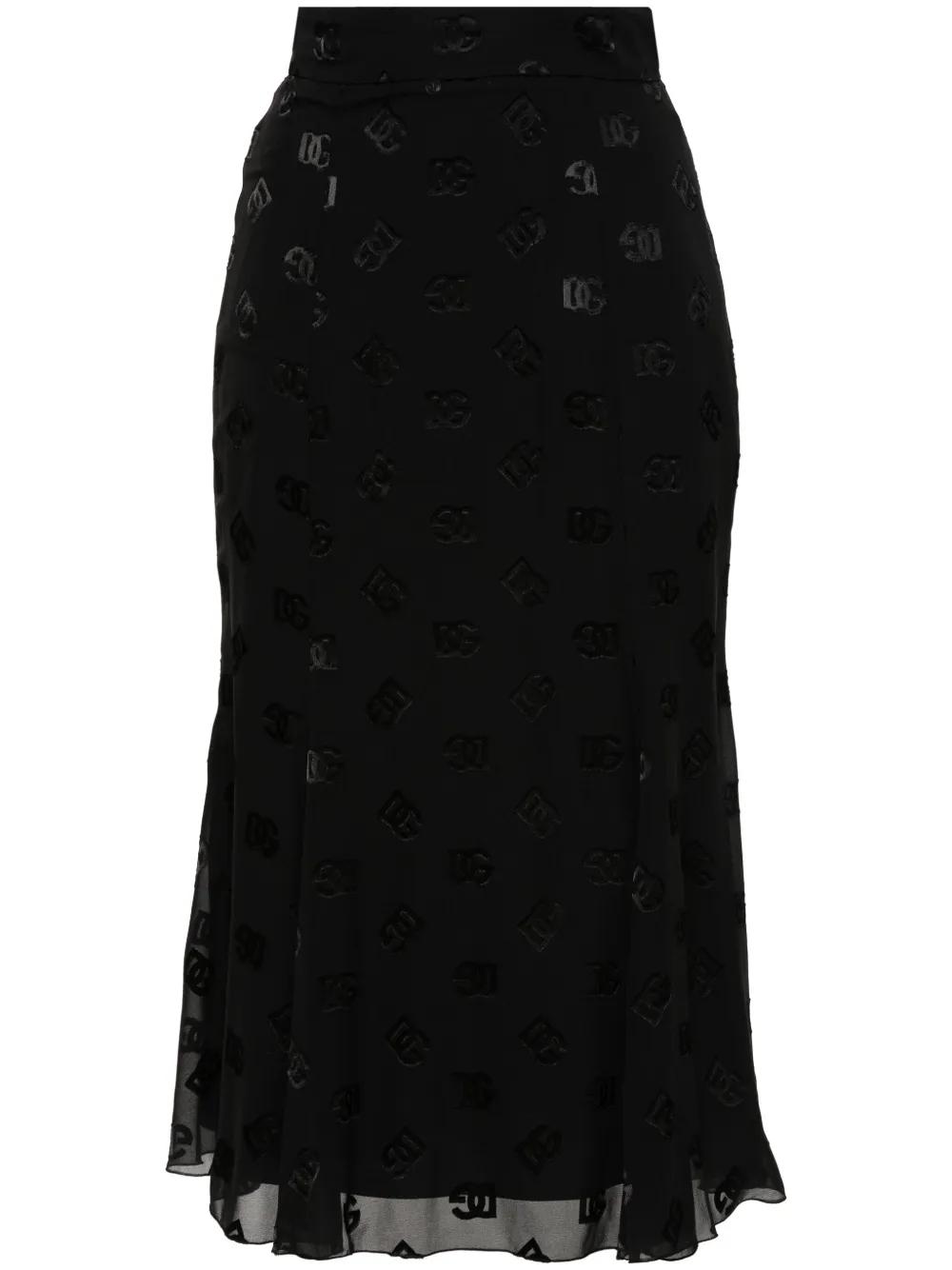 black silk blend devoré effect godet design all-over flocked 'DG' logo high-waisted straight hem mid-length full lining concealed rear zip fastening