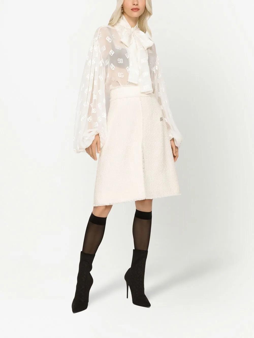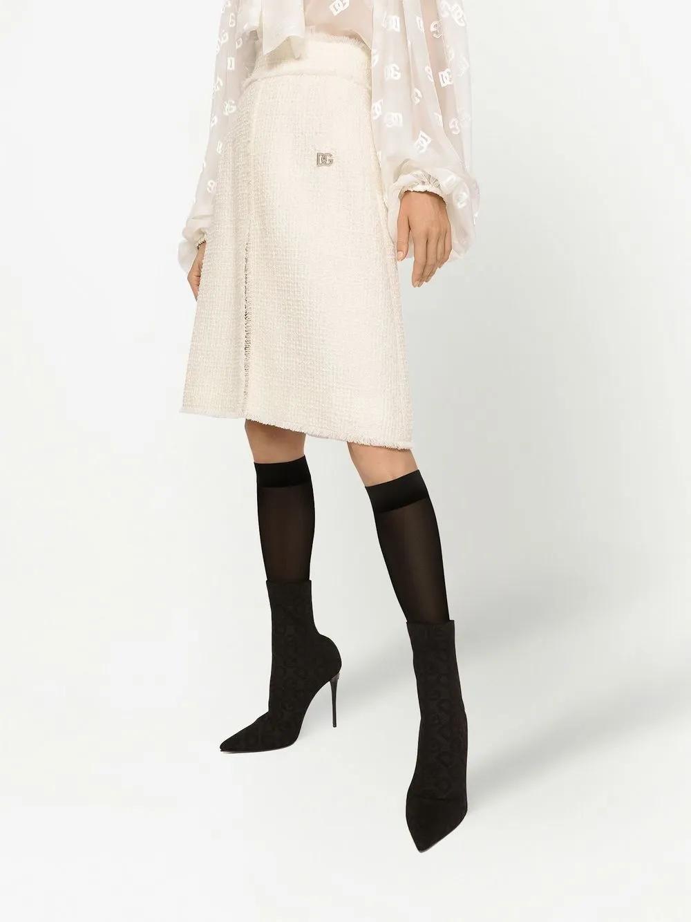 logo plaque bouclé A-line skirt from DOLCE & GABBANA featuring cream white, wool blend, bouclé construction, high-waisted, A-line, mid-length, logo plaque, concealed rear zip fastening and frayed edge.