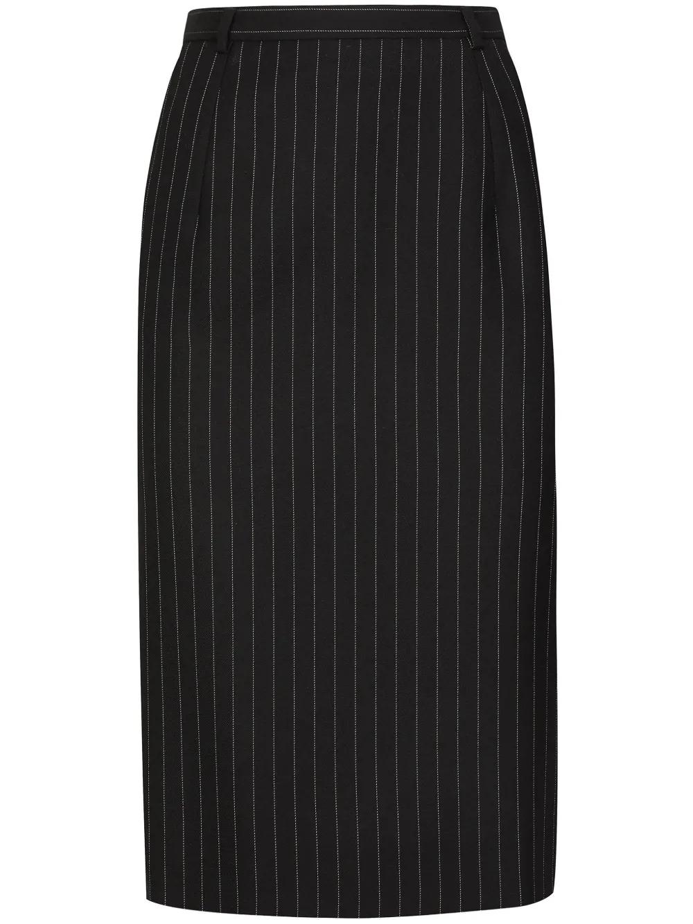 black virgin wool pinstripe pattern concealed rear zip fastening high-waisted two side slit pockets two rear welt pockets straight hem knee-length stretch-silk lining