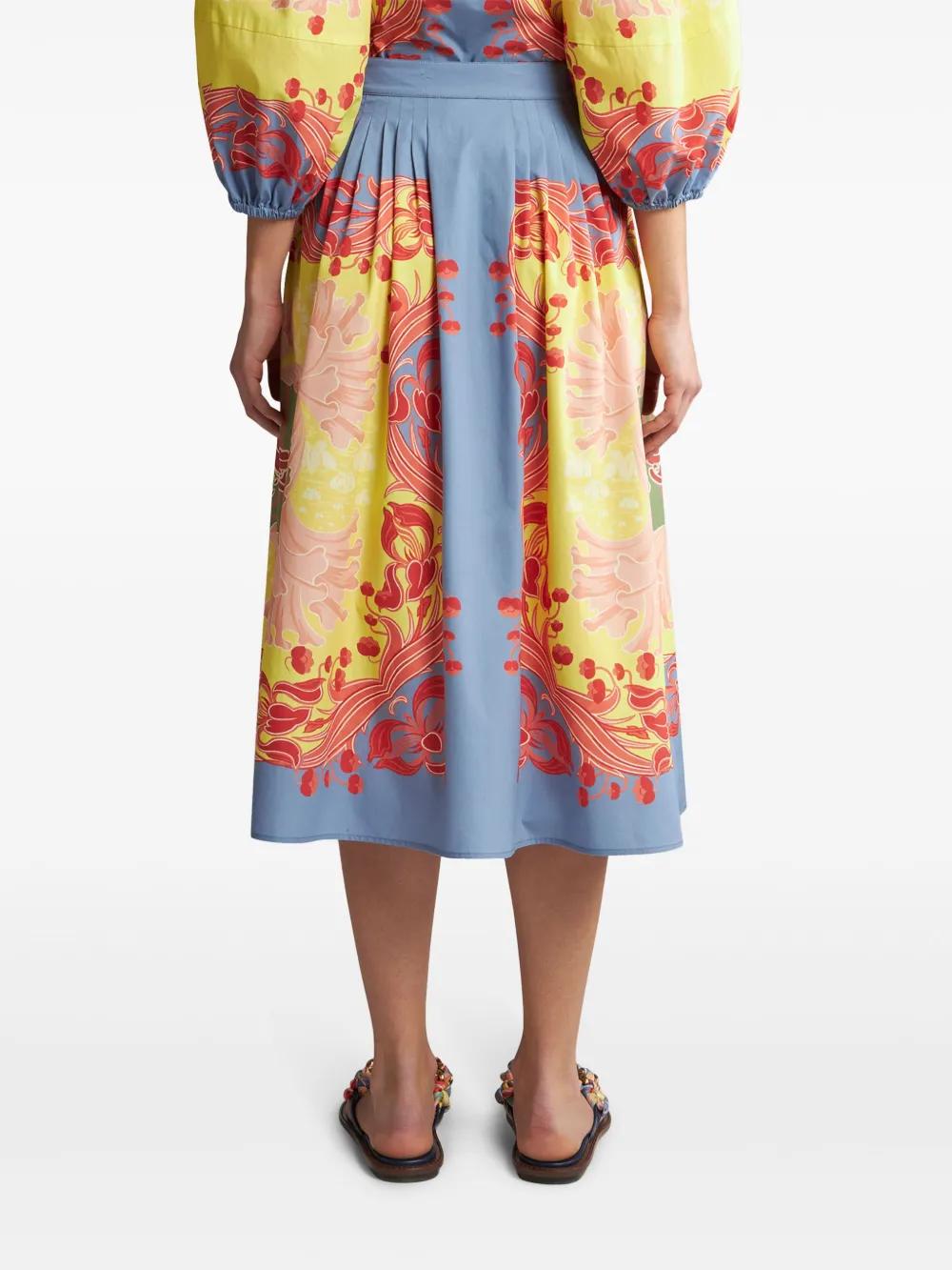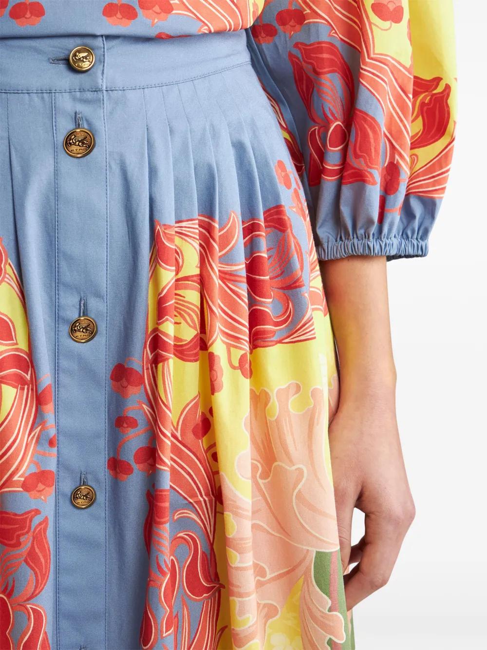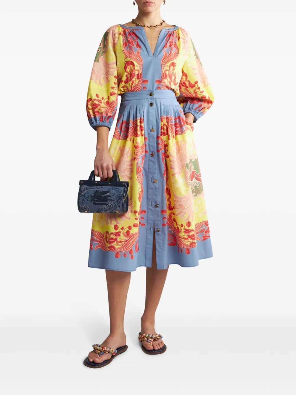 blue/yellow/red cotton poplin texture paisley print fully pleated front button fastening mid-length