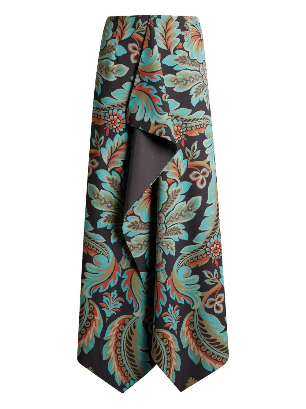 black/multicolour asymmetric hem draped detail paisley print concealed zip fastening