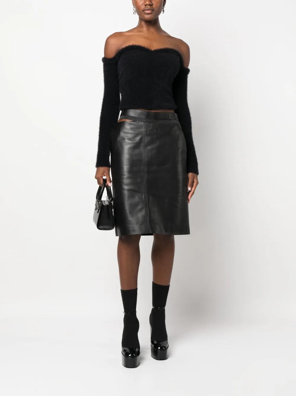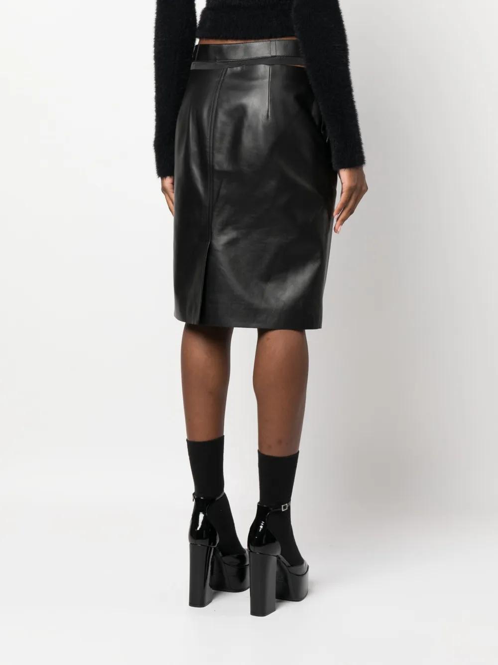 black calf leather logo waistband cut-out detailing rear slit side zip fastening two side inset pockets straight hem knee-length