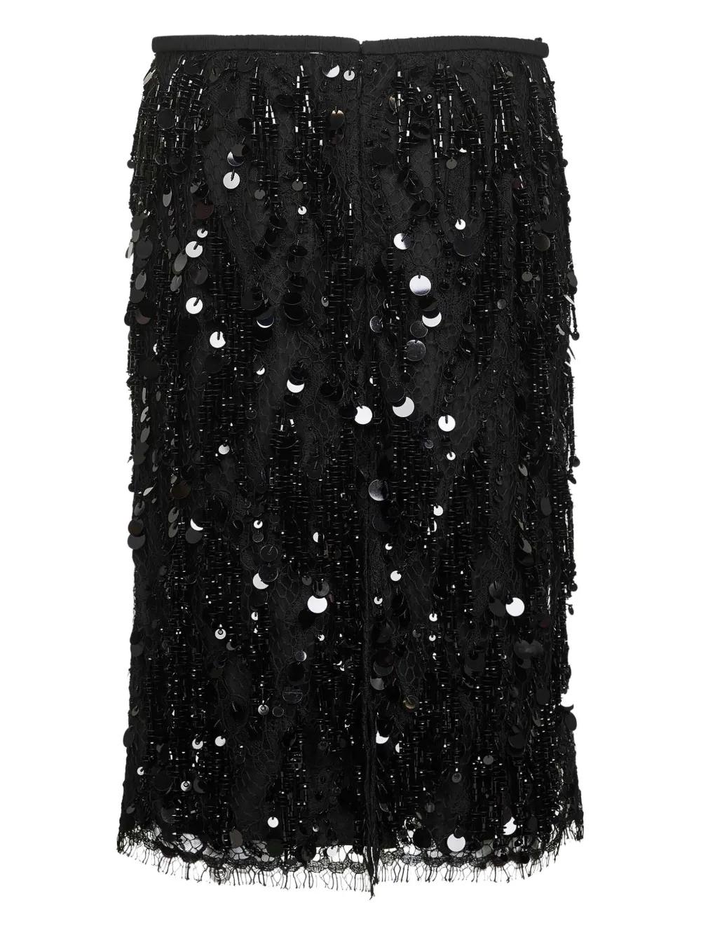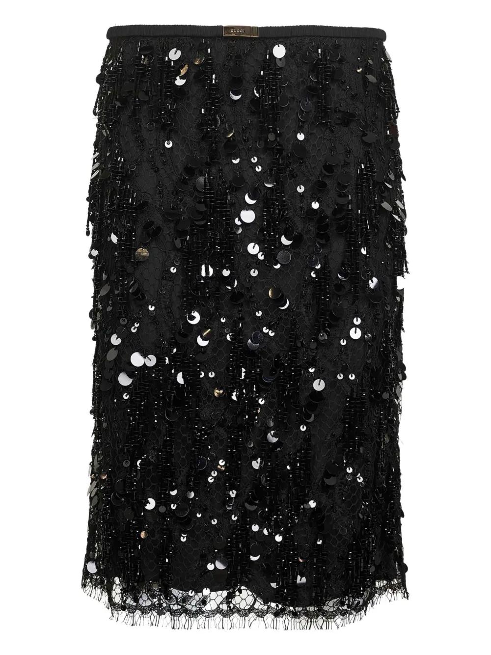 black sequin embellishment metal buckle elasticated gathered waist back zip closure