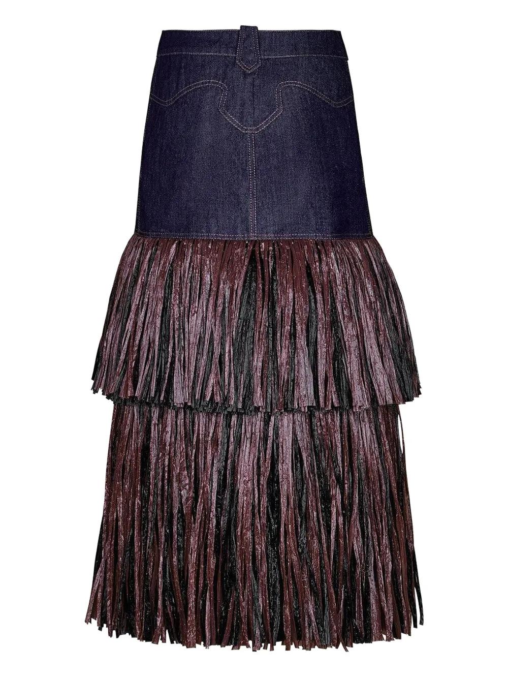 - Ten produkt został częściowo uszyty z poliestru pochodzącego z recyklingu. - Prosty, nie blokujący ruchów fason. - Model wykonany z materiału o satynowym splocie. - Elastyczna listwa w pasie. - Szerokość w pasie: 33 cm. - Długość: 97 cm. - Wymiary podane dla rozmiaru: 36.