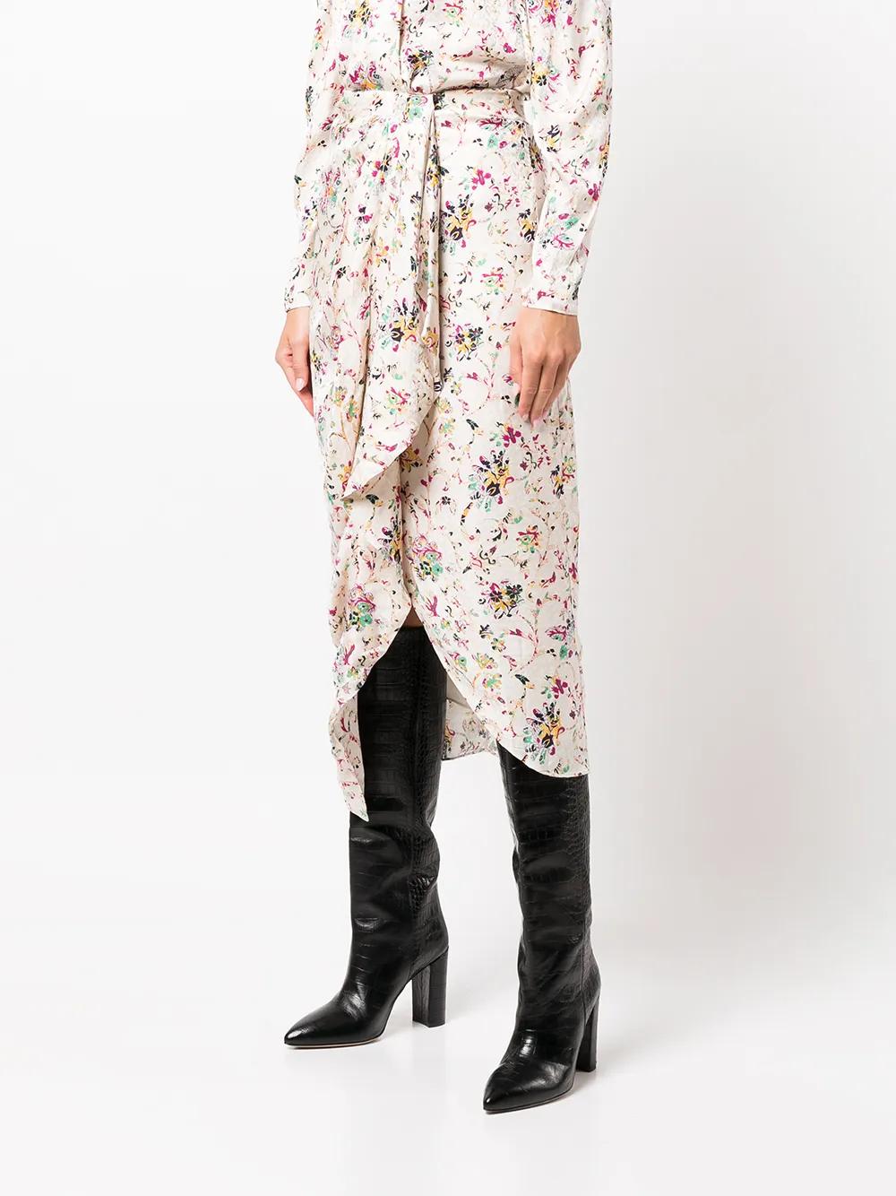 ecru/multicolour all-over floral print draped design concealed rear zip fastening mid-length