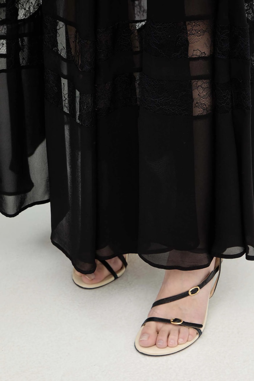 - Rozkloszowany fason. - Elastyczna listwa w pasie. - Model na podszewce. - Koronkowe wstawki. - Szerokość w pasie: 33 cm. - Długość: 107 cm. - Wymiary podane dla rozmiaru: 36.