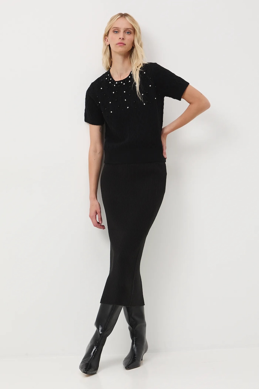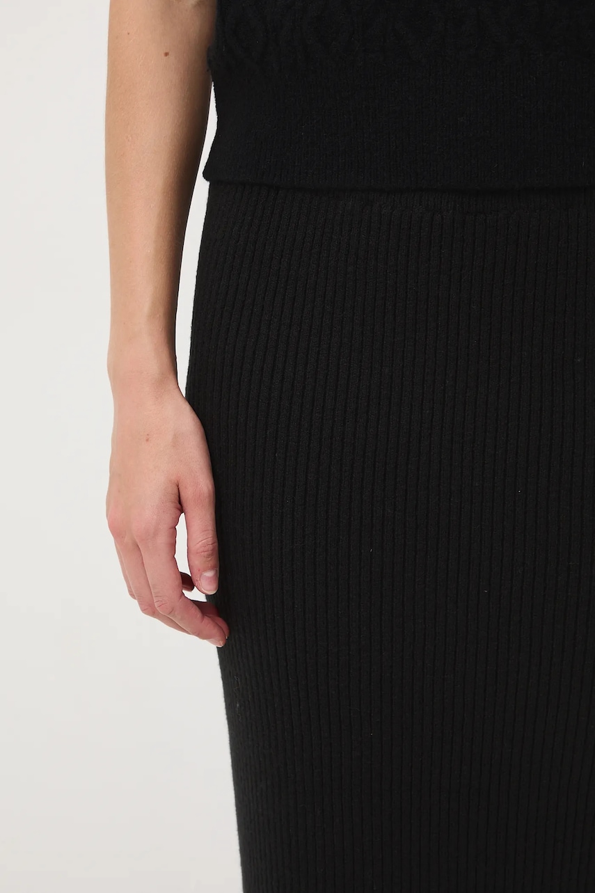 - Prosty fason. - Podwyższony stan z elastyczną listwą w pasie. - Prążkowana dzianina. - Melanżowa dzianina. - Model o długości maxi. - Szerokość w pasie: 35 cm. - Długość: 78 cm. - Wymiary podane dla rozmiaru: S.