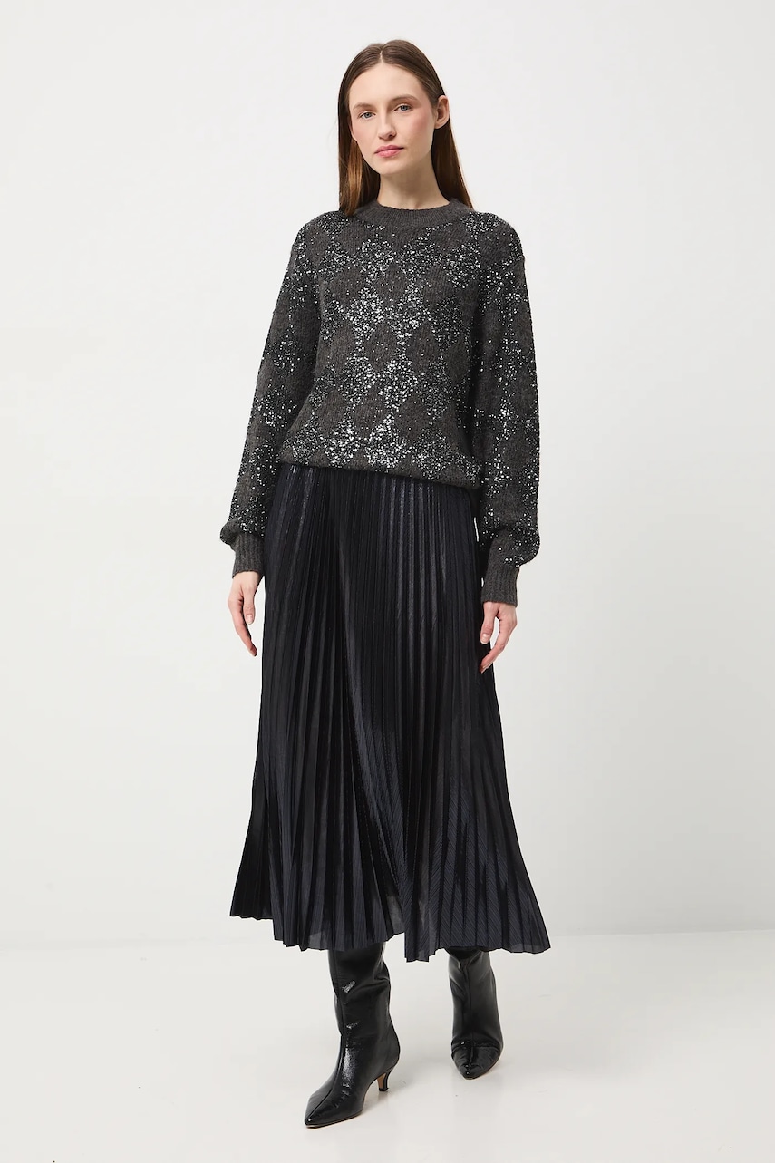 - Rozkloszowany fason. - Elastyczna listwa w pasie. - Plisowany materiał. - Materiał z fakturą. - Model o długości midi. - Szerokość w pasie (przed rozciągnięciem): 33 cm. - Szerokość w pasie (po rozciągnięciu): 48 cm. - Długość: 85 cm. - Wymiary podane dla rozmiaru: S.