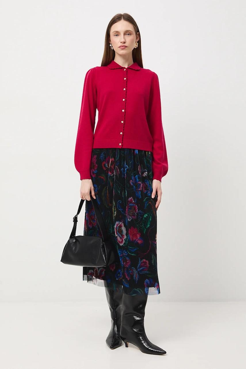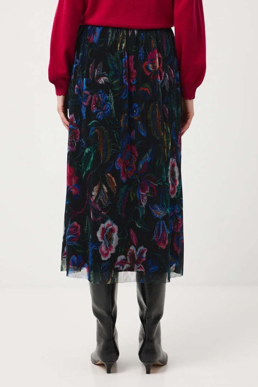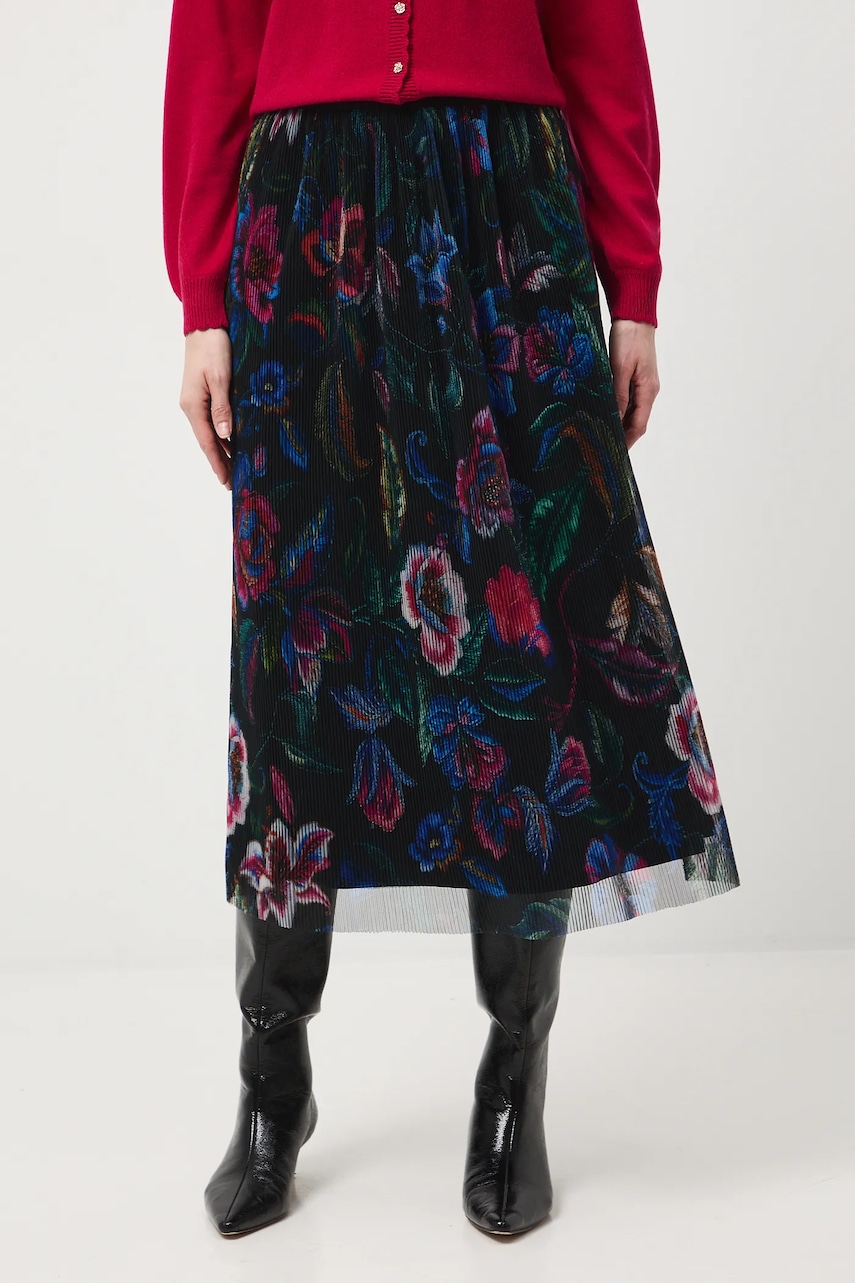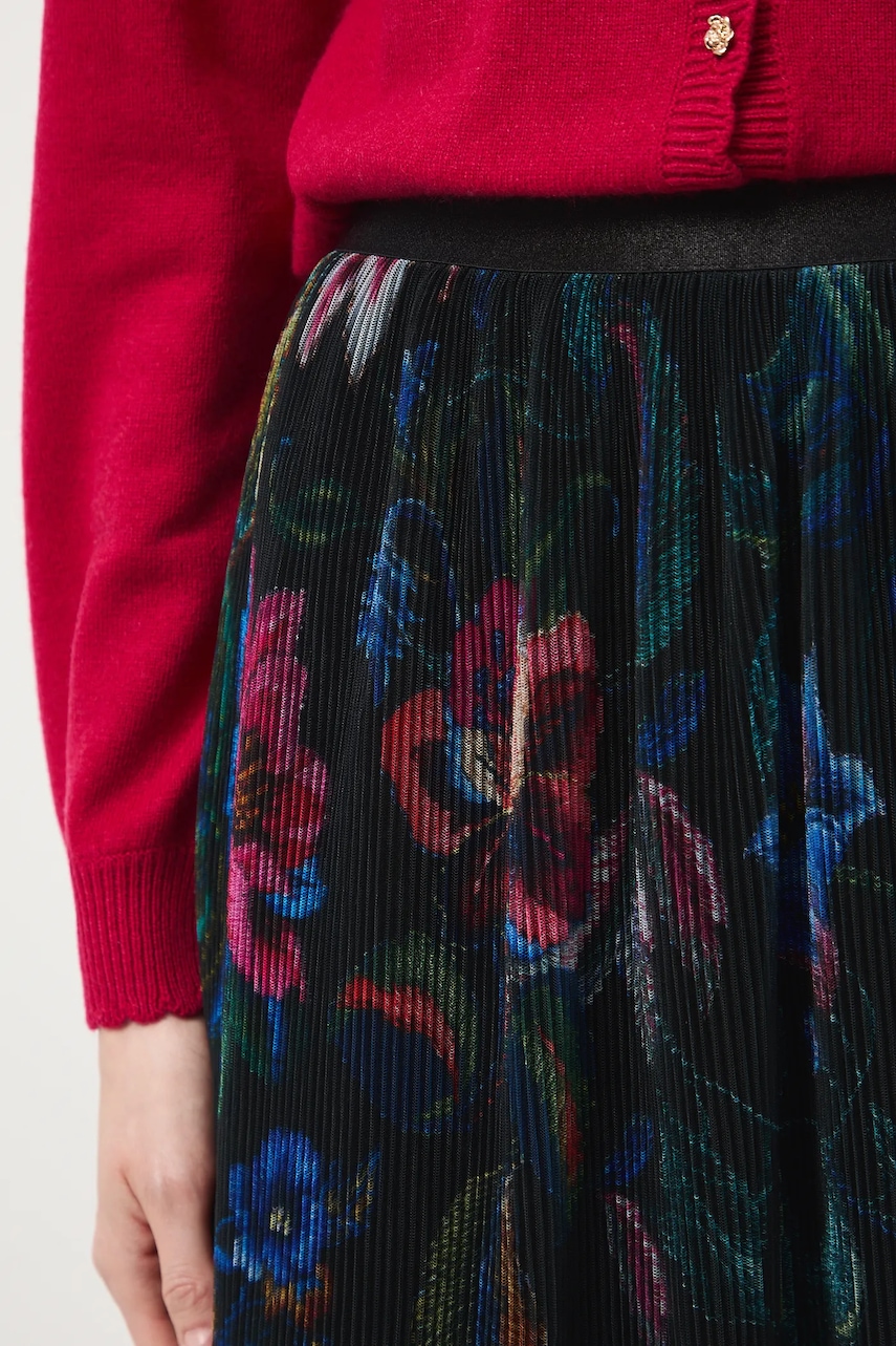 - Rozkloszowany fason. - Elastyczna listwa w pasie. - Model wykonany z transparentnej siateczki. - Dodatkowa warstwa materiału w postaci podszewki. - Plisowany materiał. - Wzorzysta tkanina. - Wzór w kwiaty. - Rozmieszczenie wzoru może różnić się na każdej sztuce produktu. - Szerokość w pasie (przed rozciągnięciem): 34 cm. - Szerokość w pasie (po rozciągnięciu): 50 cm. - Długość: 84 cm. - Wymiary podane dla rozmiaru: S.