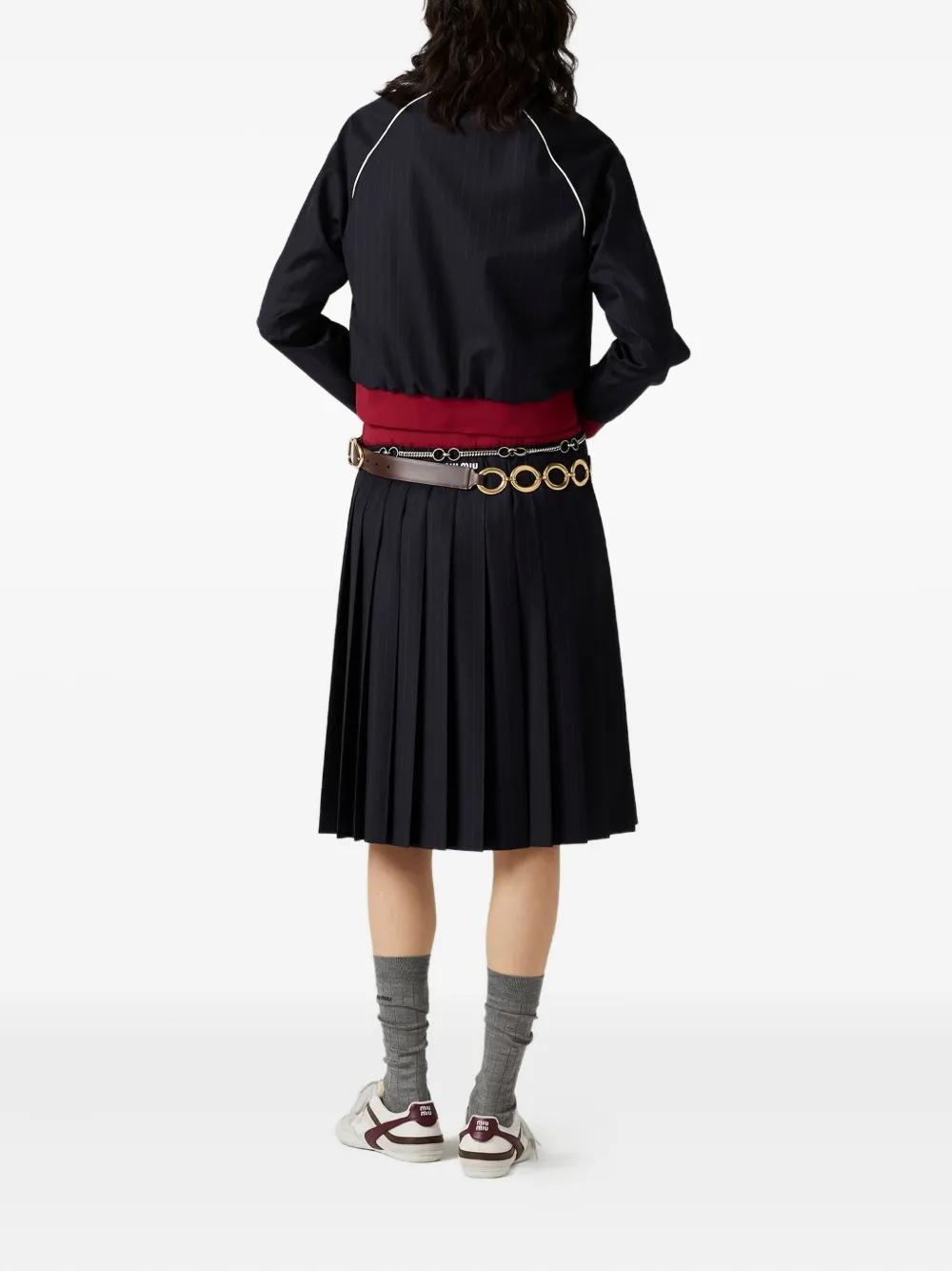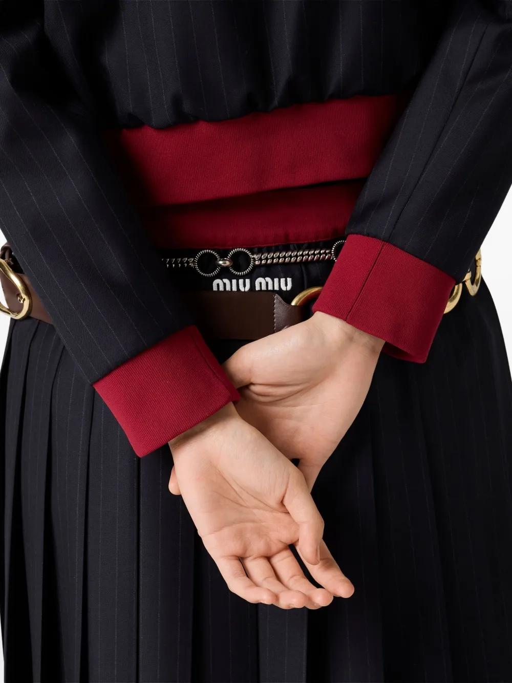 blue pinstripe pattern pleated design elasticated waistband burgundy waistband