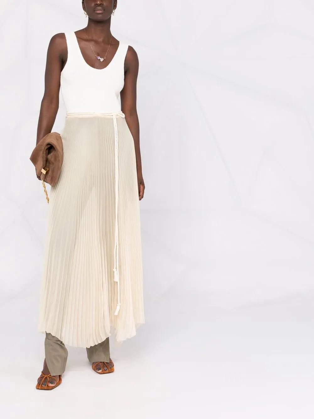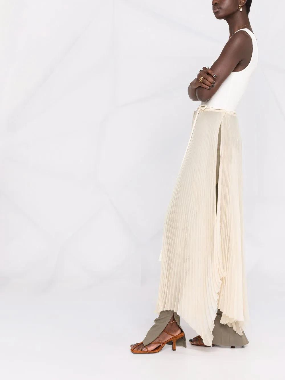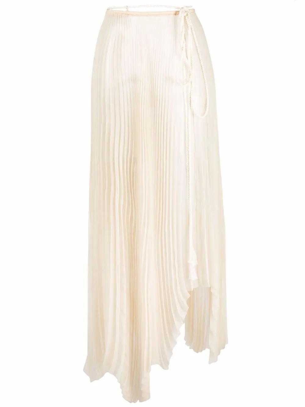 cream nude fully pleated high waist front tie fastening asymmetric hem mid-length