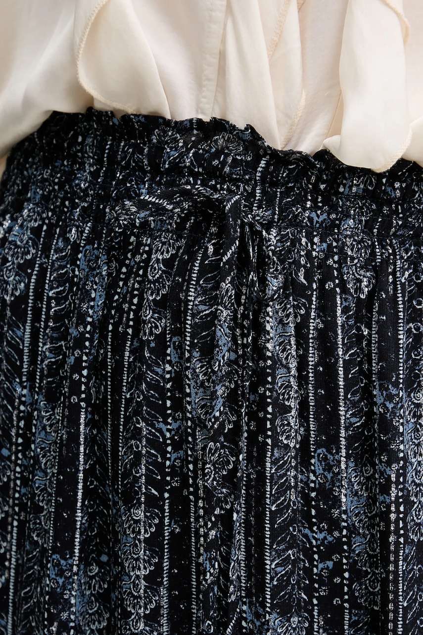 - Wzorzysty materiał. - Materiał z metaliczną nicią. - Model o długości midi. - Model z ozdobną falbaną. - Model na podszewce. - Elastyczna gumka w pasie. - W pasie regulacja szerokości za pomocą troczków. - Długość: 85 cm. - Szerokość w pasie: 40 cm. - Wymiary podane dla rozmiaru: S.