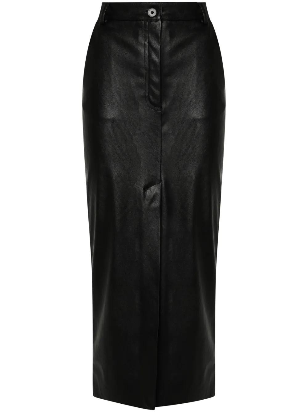 black faux leather belt loops two diagonal pockets to the sides front slit straight hem mid-length concealed fly and button fastening