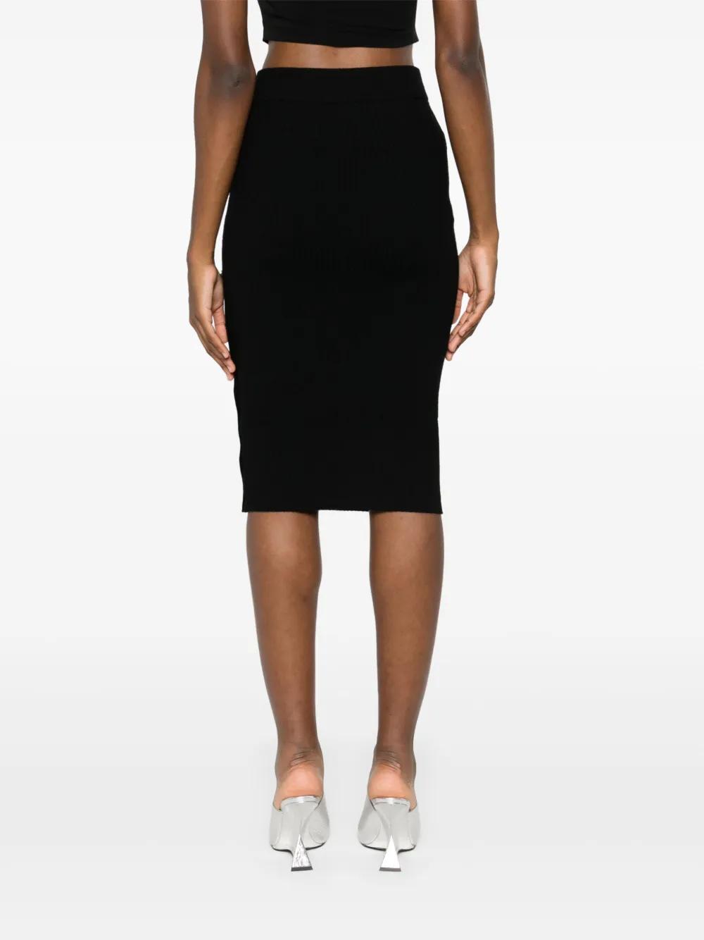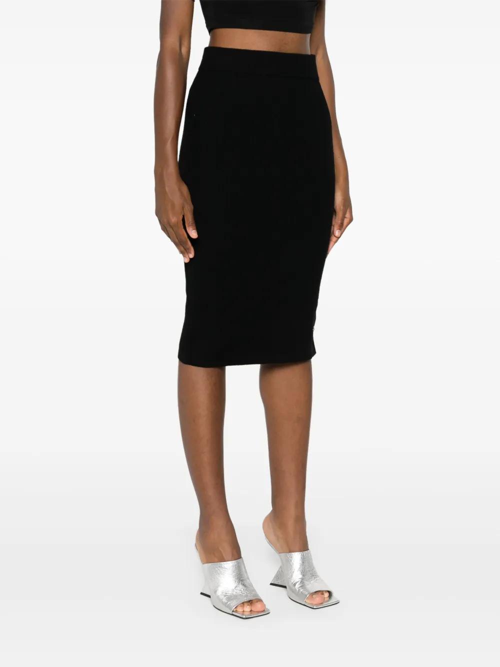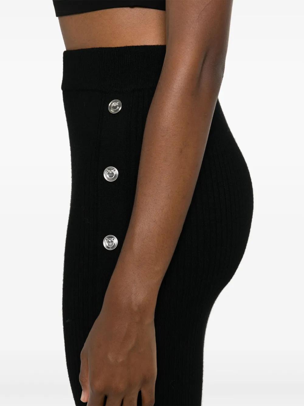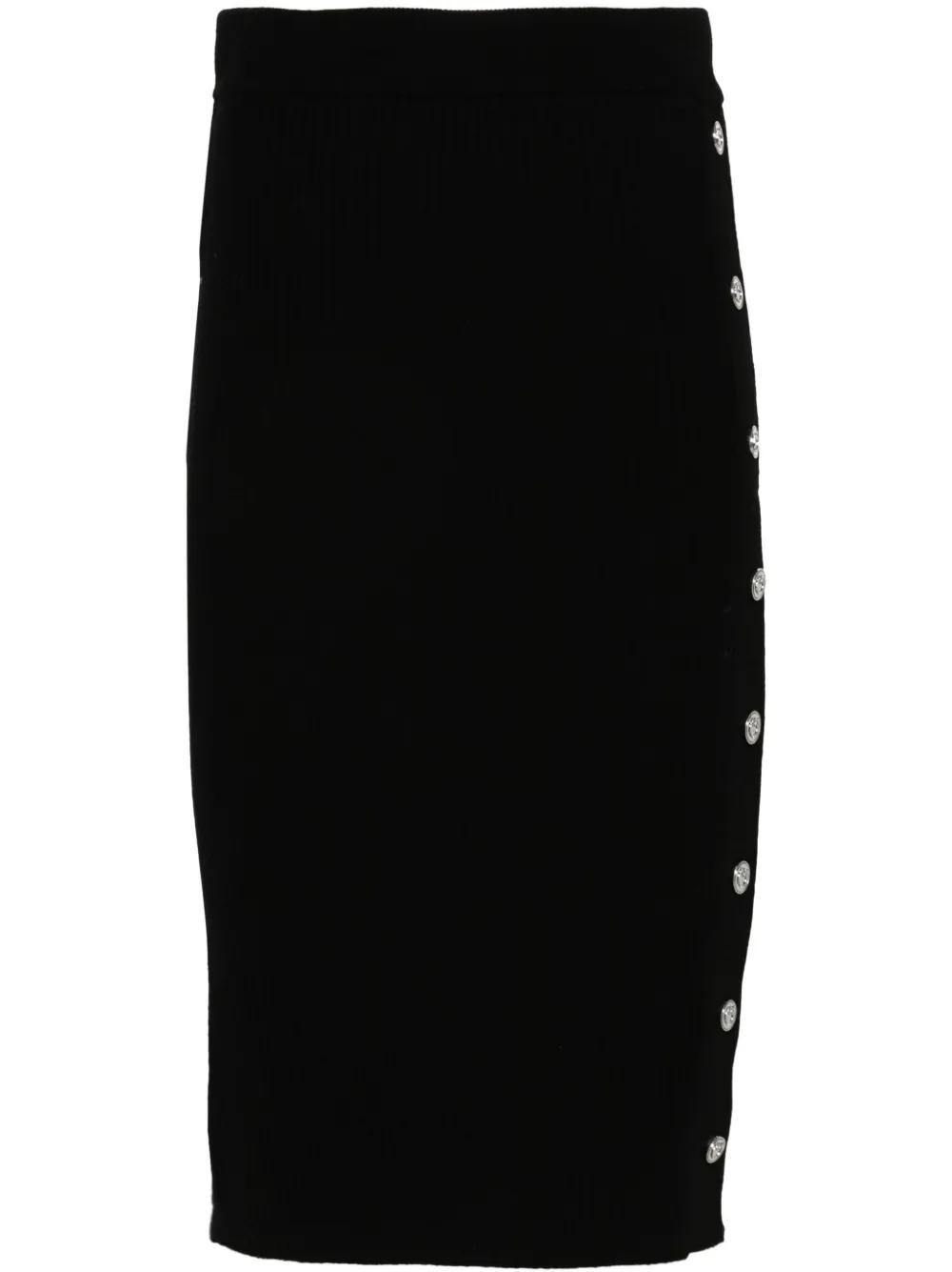 black wool blend ribbed knit elasticated waistband straight hem silver-tone logo-embossed buttons side press-stud fastening