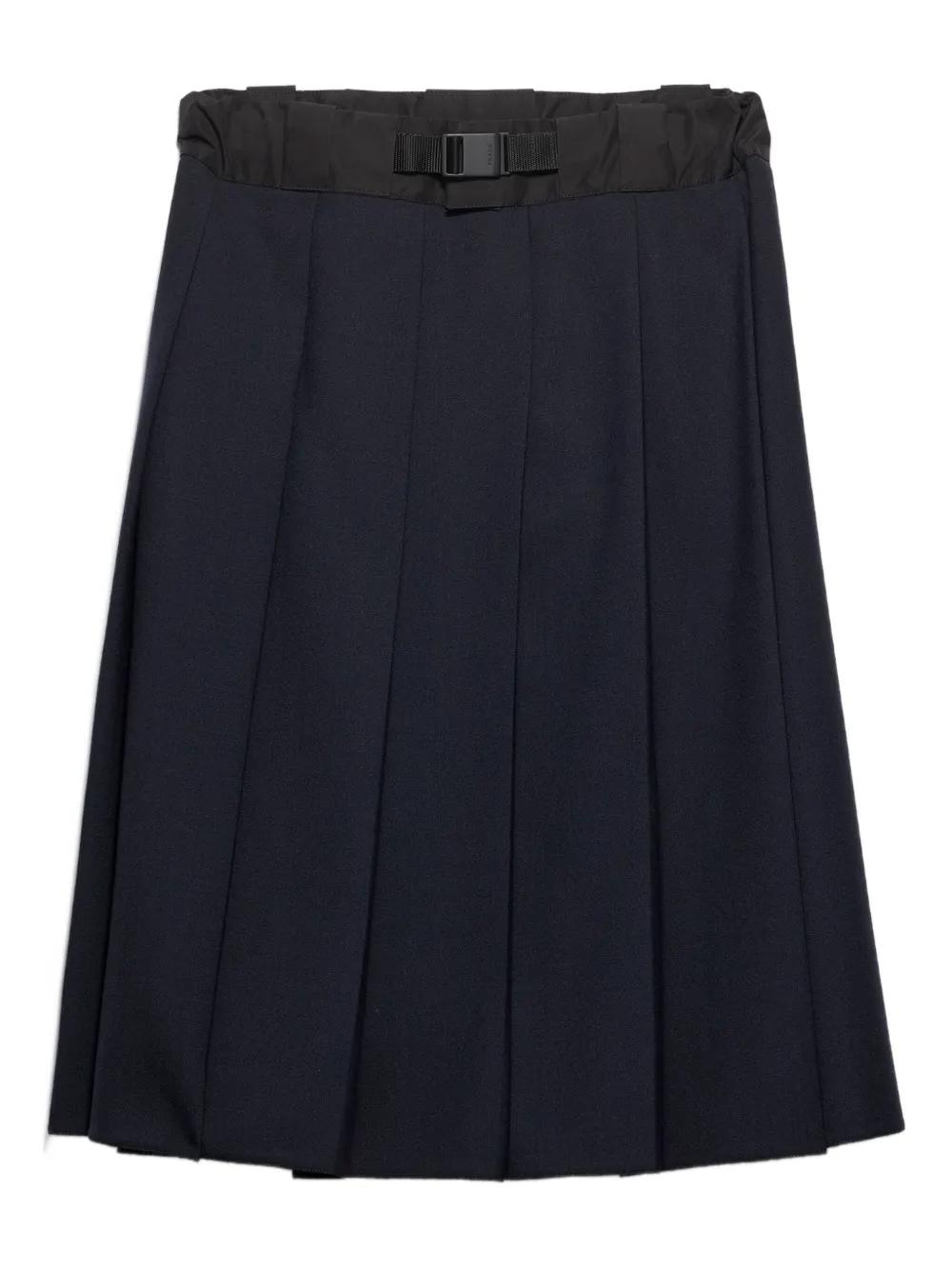 light blue organic cotton denim panelled design logo patch to the rear contrast stitching high waist belt loops off-centre front button fastening classic five pockets two side patch pockets front slit straight hem mid-length