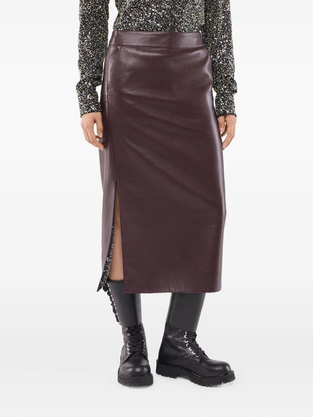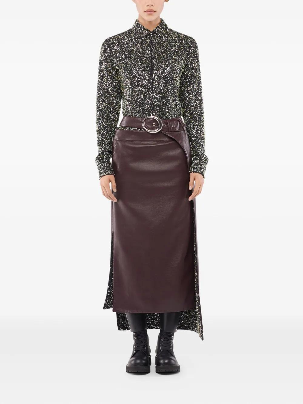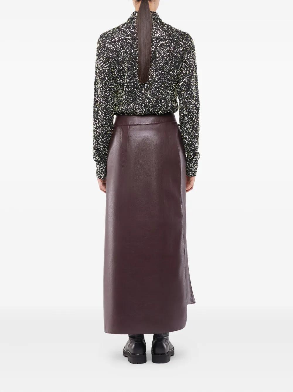 dark brown faux leather asymmetrical hem side split belted waist wrap-around effect