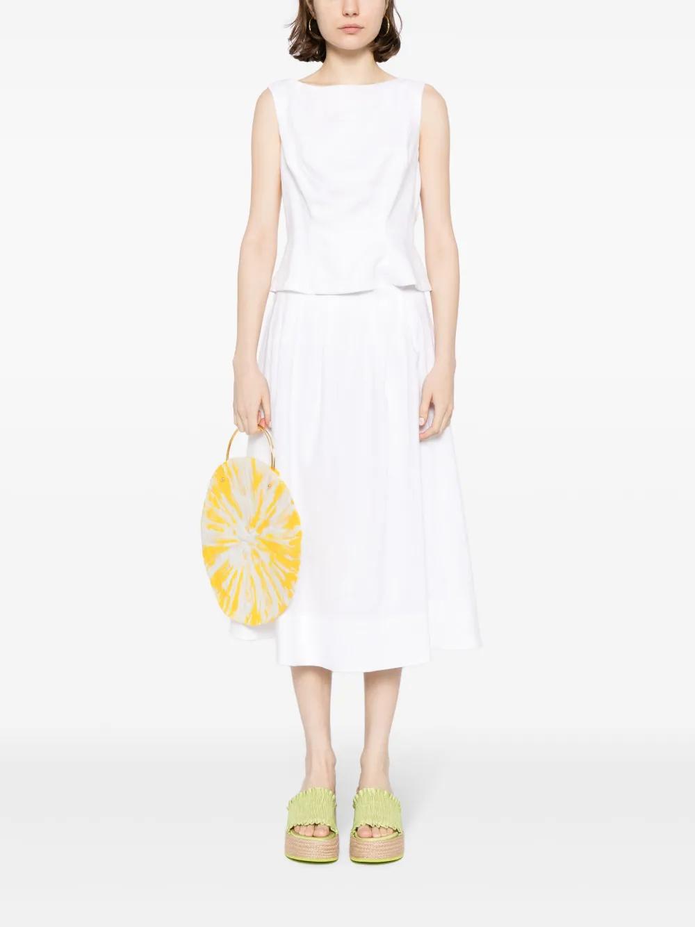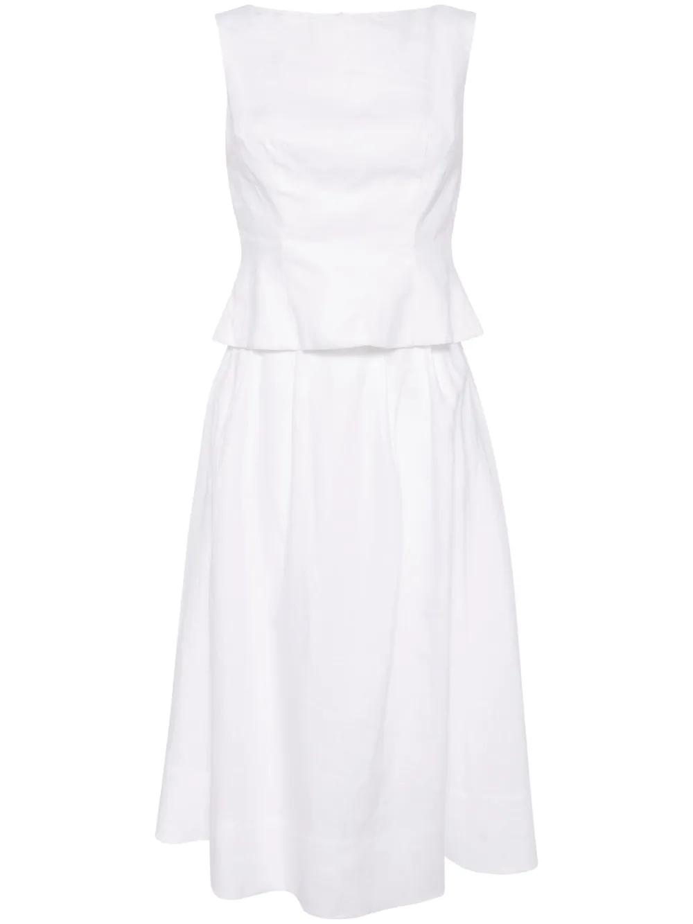 white linen/flax boat neck dart detailing sleeveless peplum hem rear button and zip fastening concealed side zip fastening pleat detailing A-line below-knee length straight hem