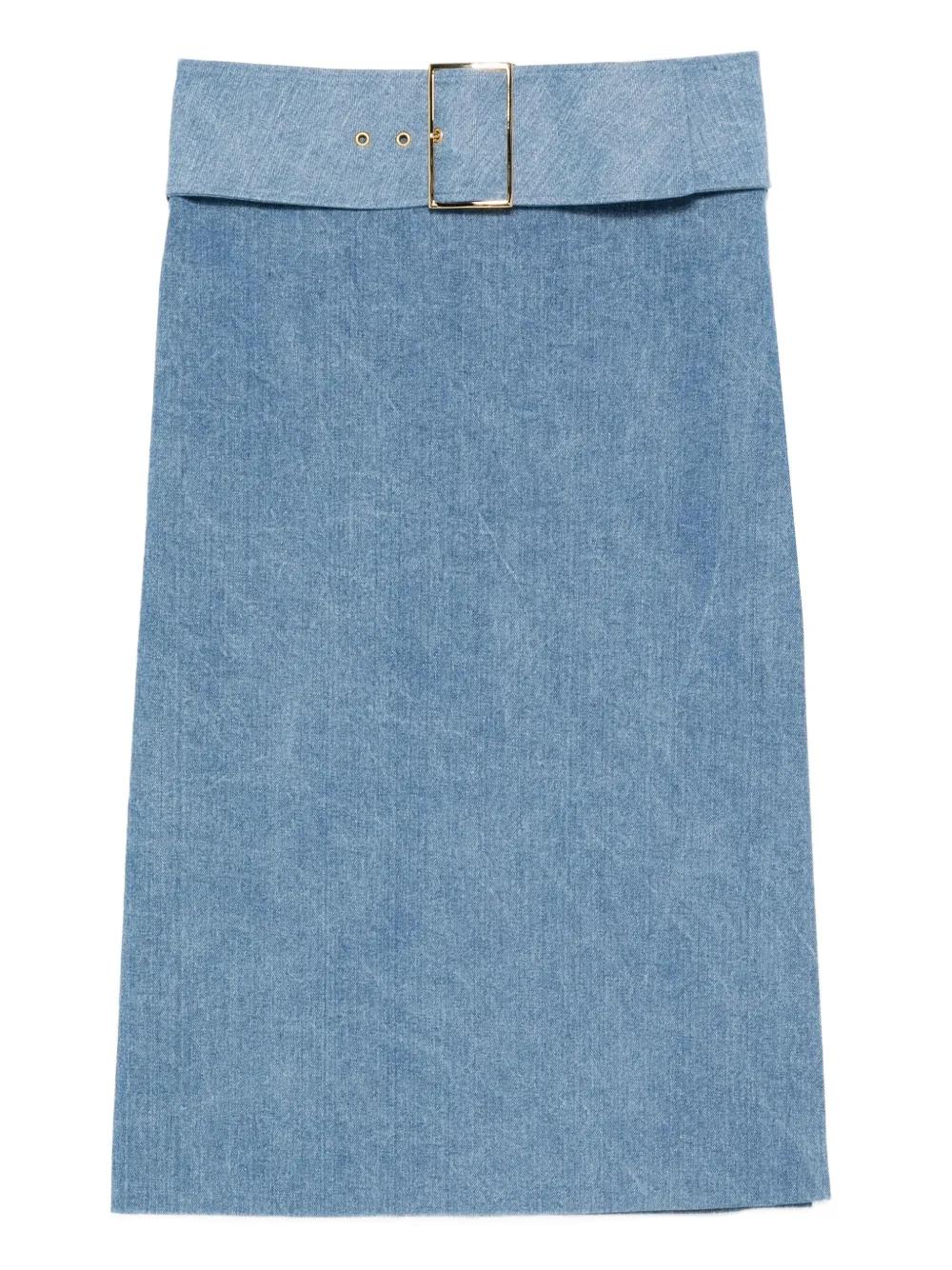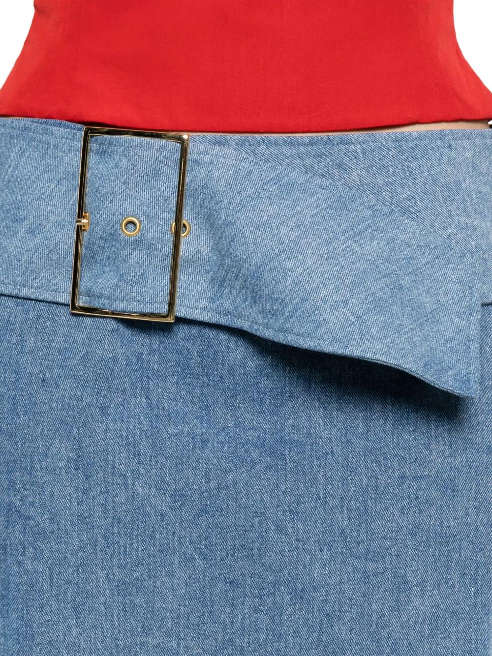 light blue cotton belted waist rectangular buckle straight hem A-line shape