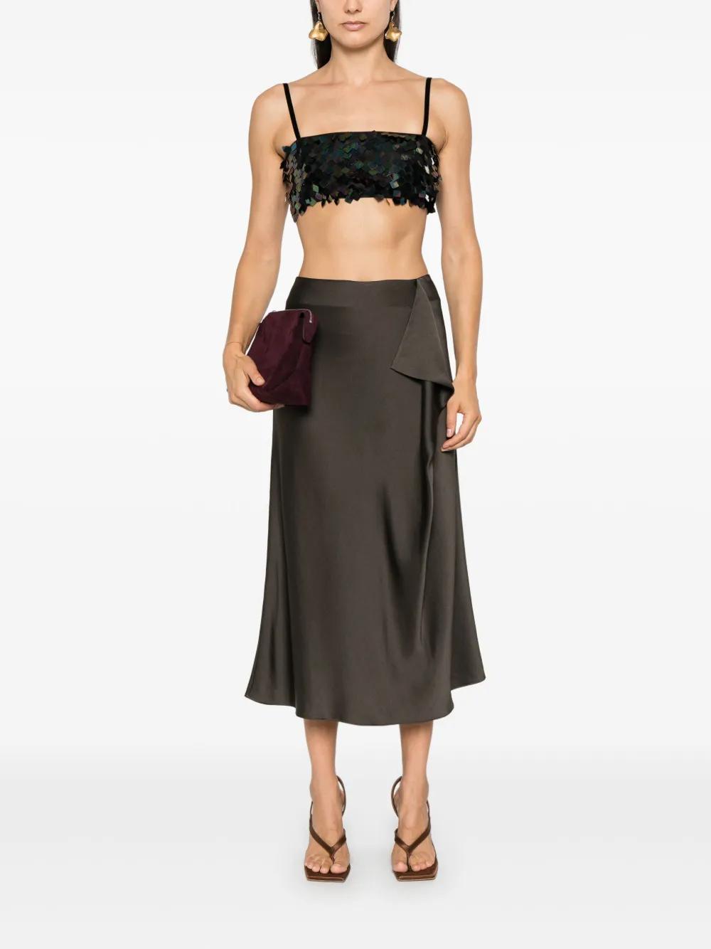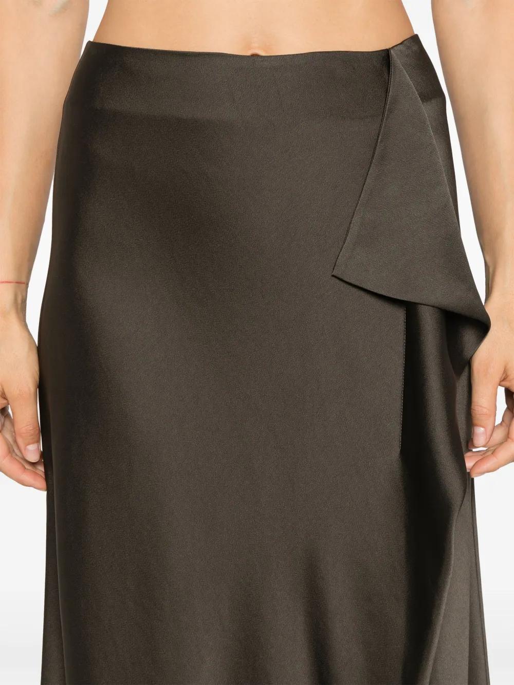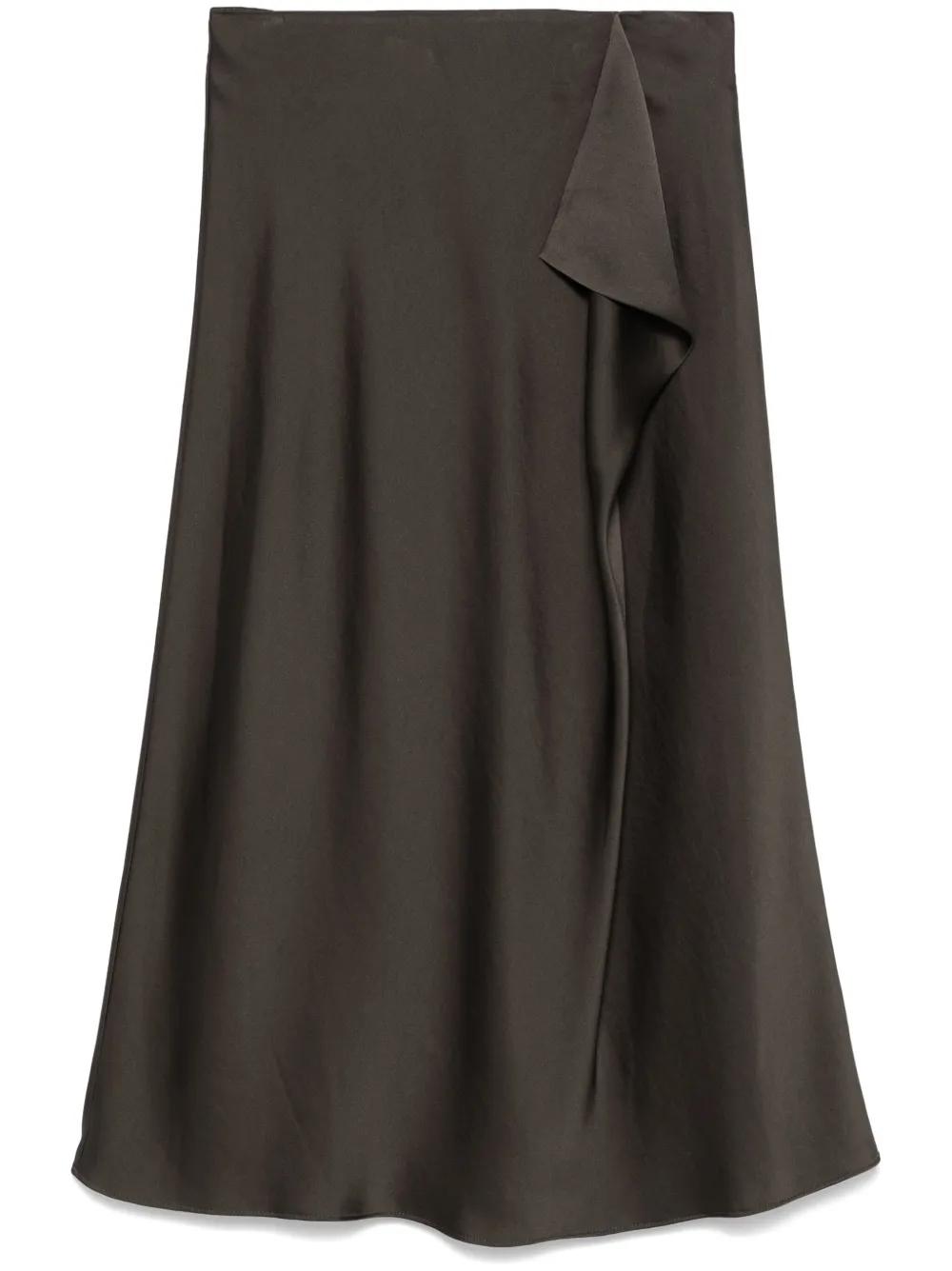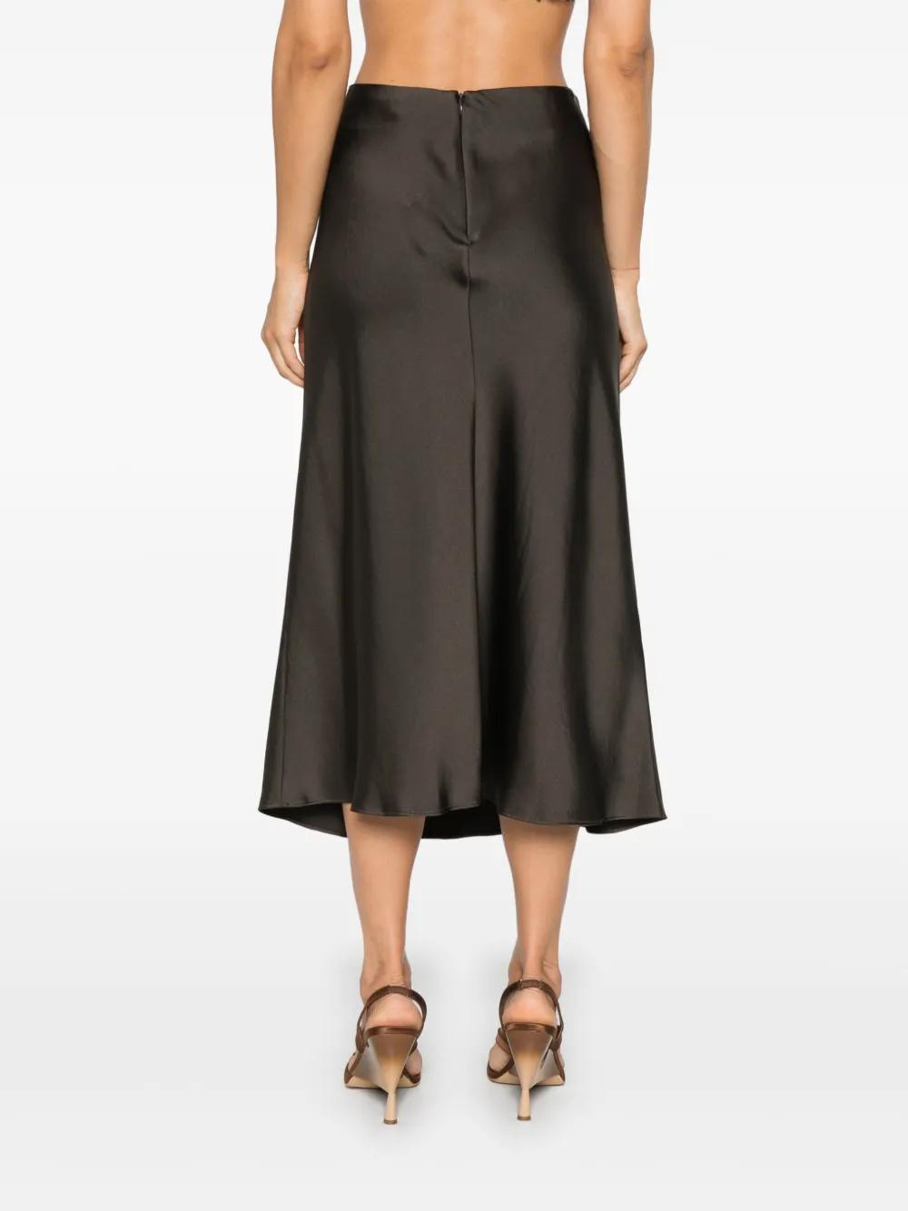 chocolate brown satin finish concealed rear hook and zip fastening draped detailing unlined A-line straight hem mid-length
