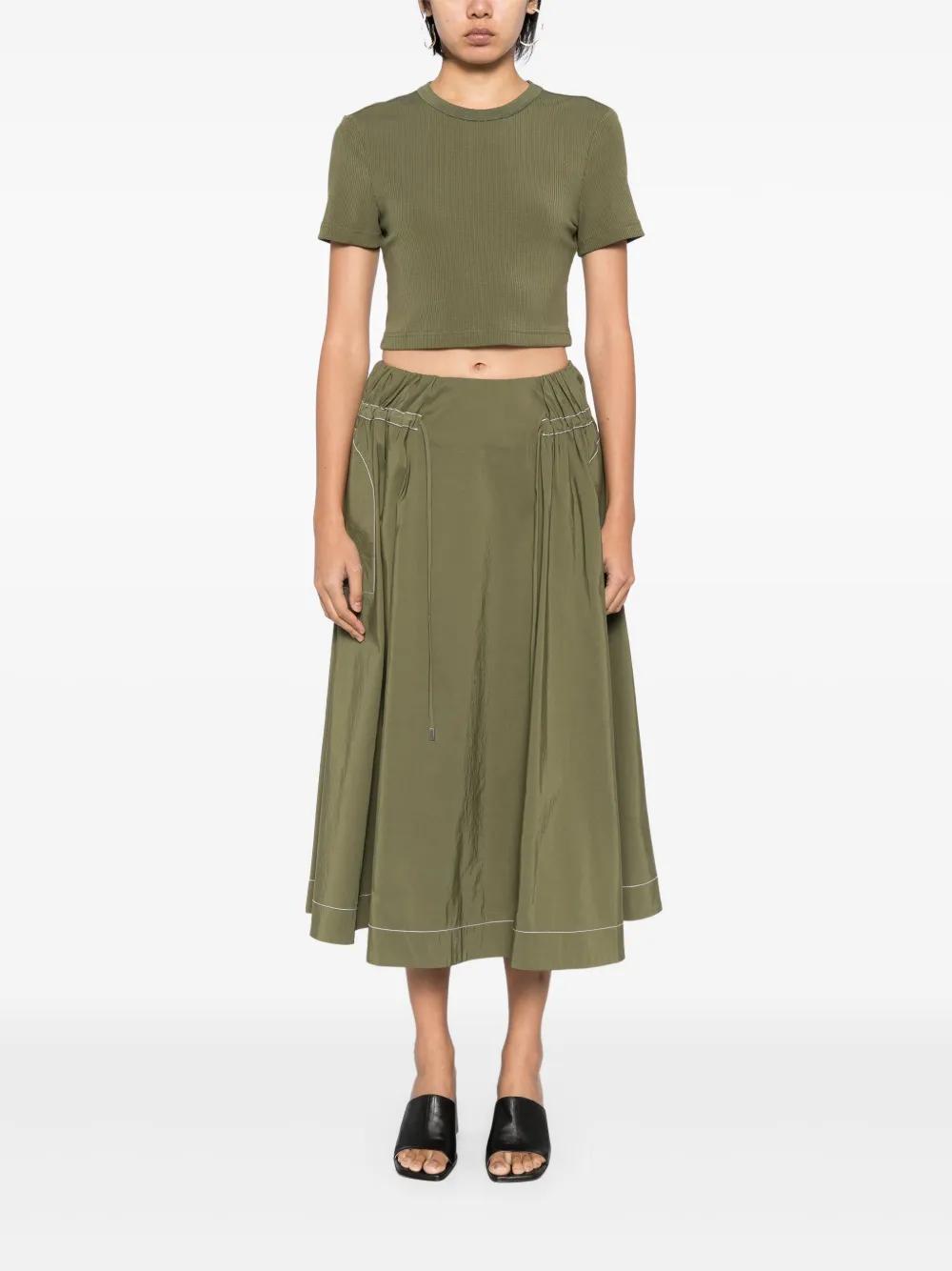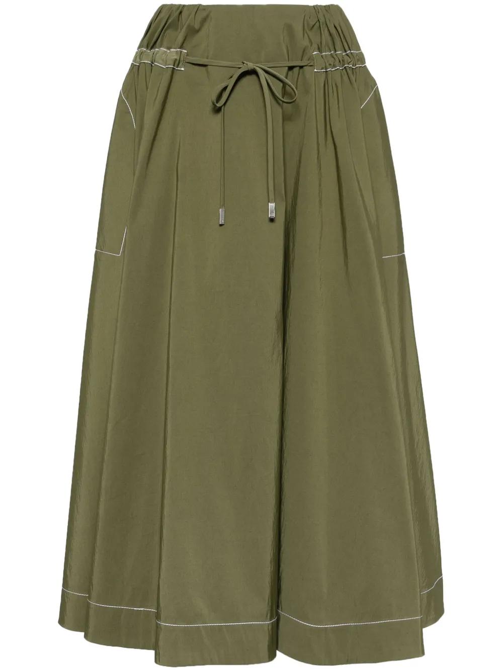 army green cotton blend side zip fastening contrast stitching mid-length A-line elasticated drawstring waistband two side welt pockets curved hem