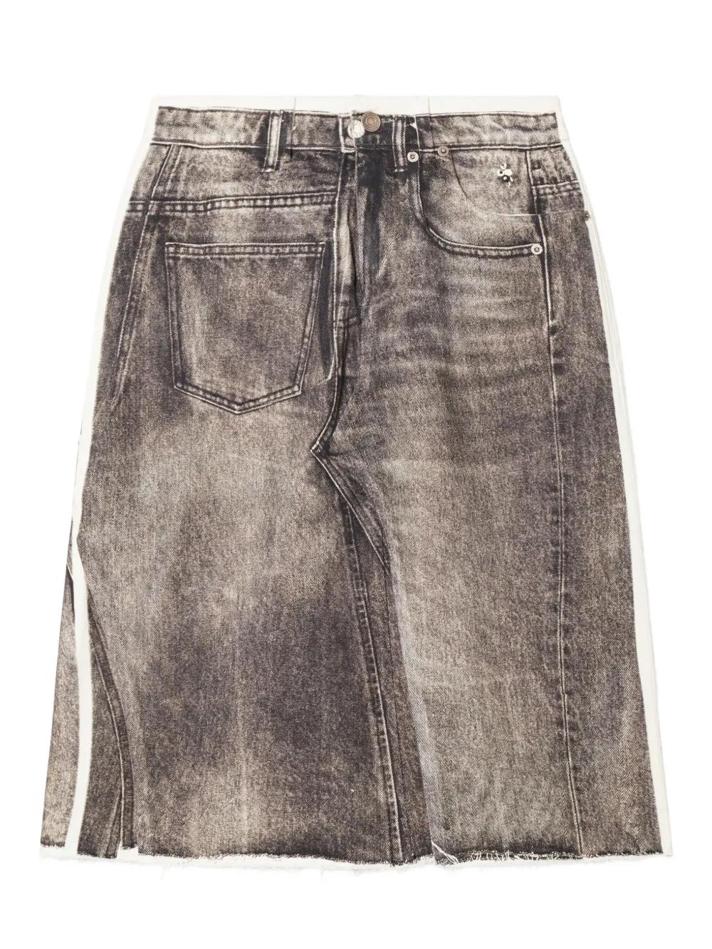 soft sable brown acid wash effect A-line shape front panel seam raw-edge hem