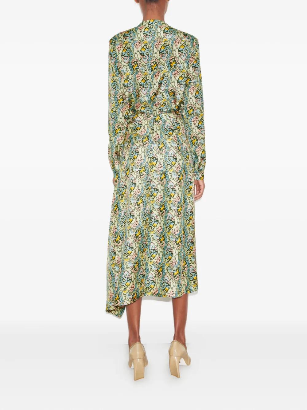 blue silk paisley print asymmetric hem wrap front self-tie ribbon waist midi length