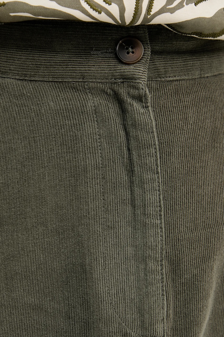 - Rozkloszowany fason. - Wsuwane kieszenie. - Zapięcie na guzik i suwak. - Cienka, nieelastyczna tkanina. - Szerokość w pasie: 33 cm. - Z tyłu elastyczna listwa. - Długość: 86 cm. - Wymiary podane dla rozmiaru: 34.