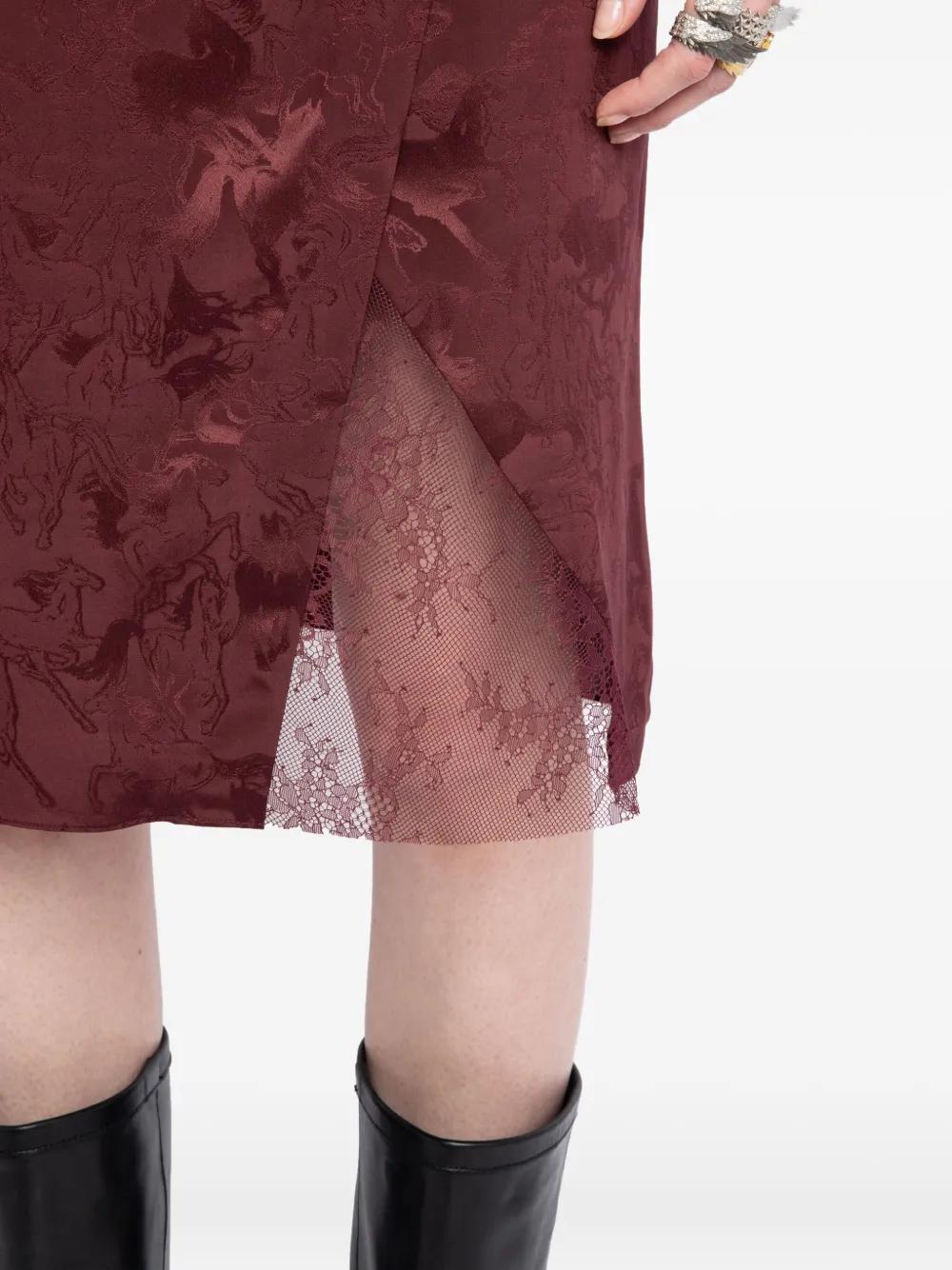 burgundy all-over horse motif floral lace insert midi length zip fastening