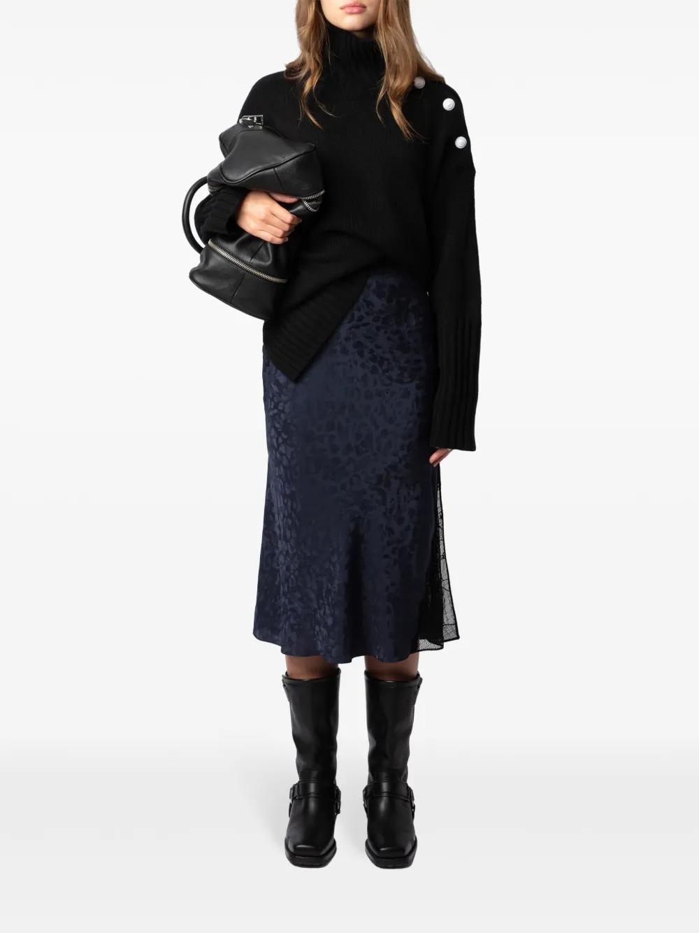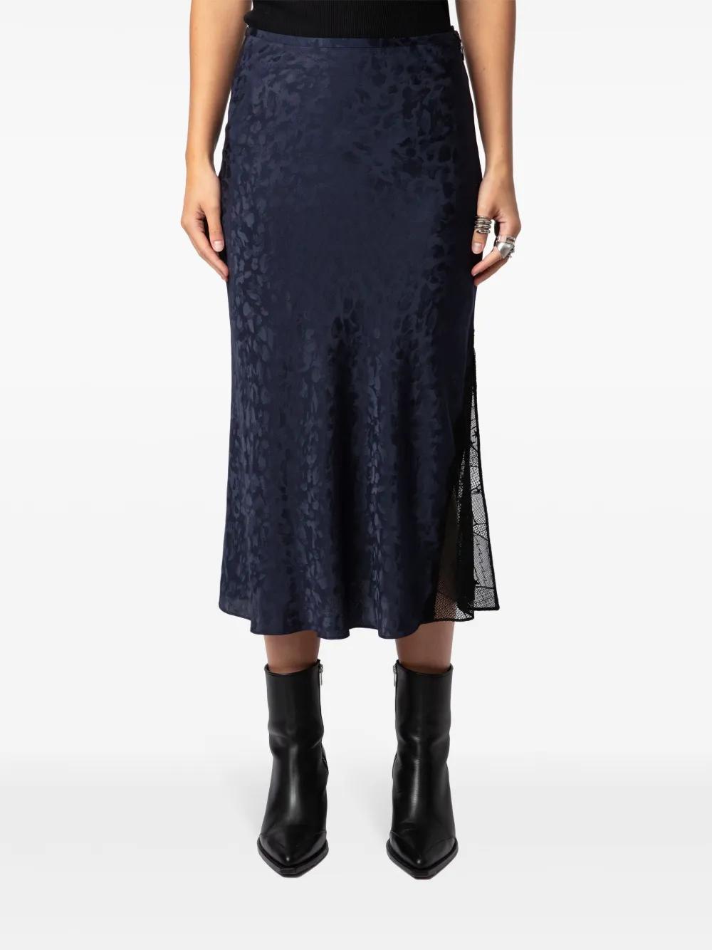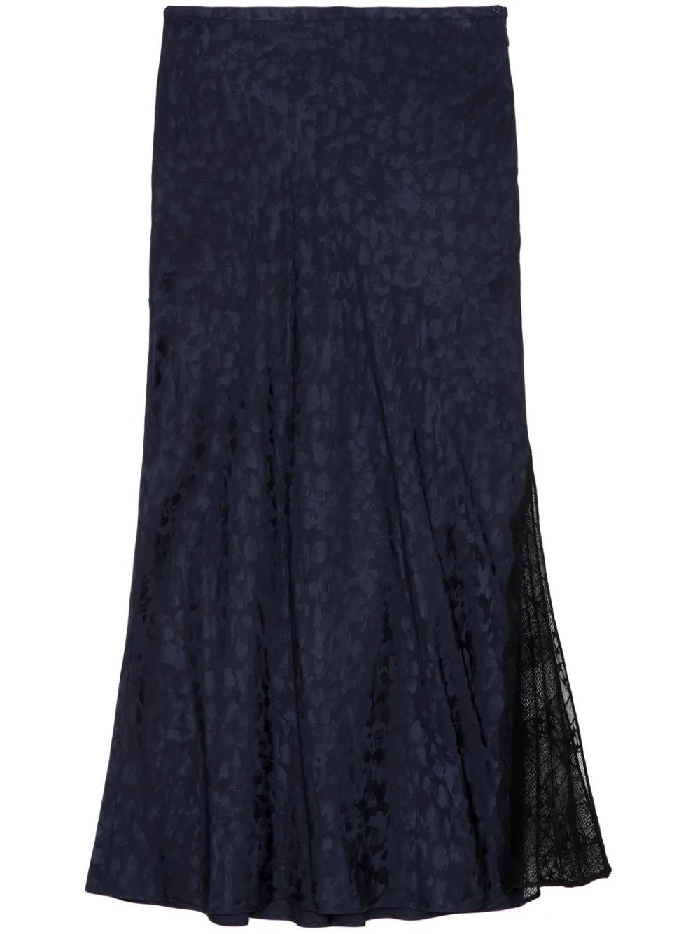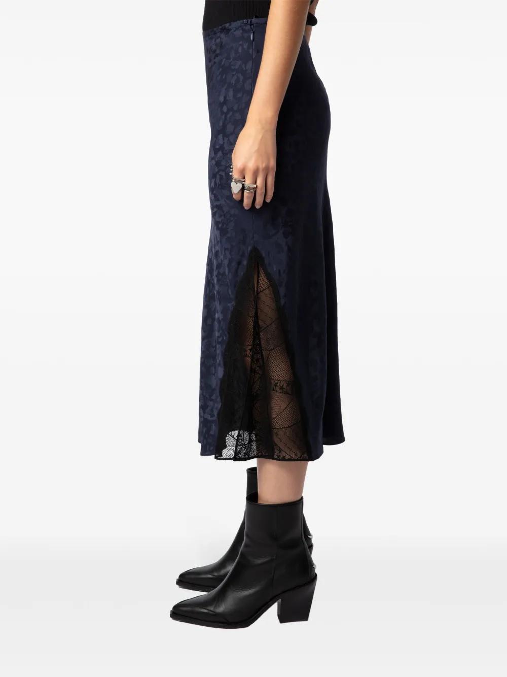 navy blue silk all-over leopard print lace detailing flared hem side zip fastening mid-length
