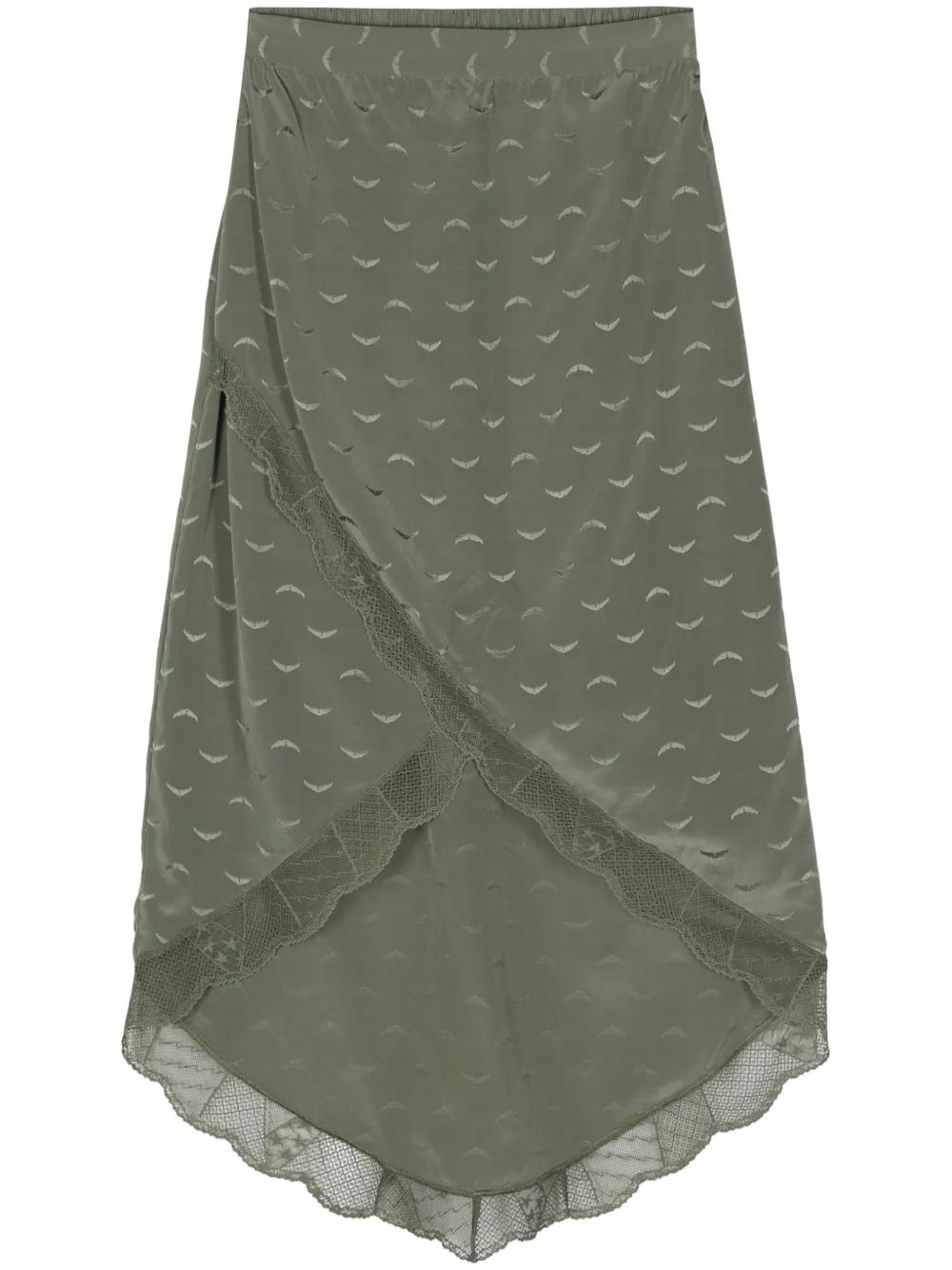 olive green silk satin finish all-over logo print wrap design lace detailing asymmetric hem mid-length unlined rear elasticated waistband