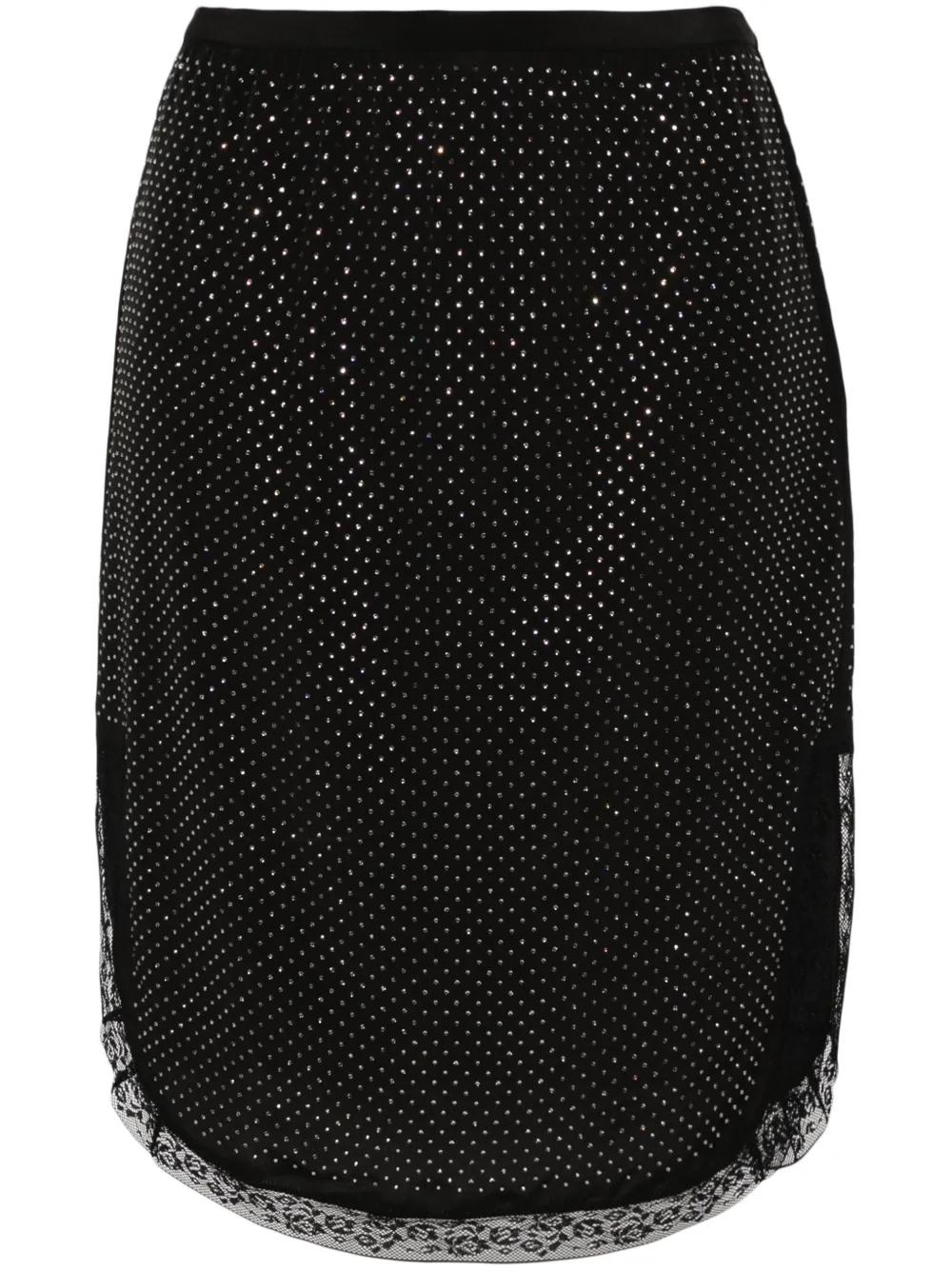 black silk crepe texture crystal embellishment elasticated waistband lace trim side slits knee-length curved hem unlined