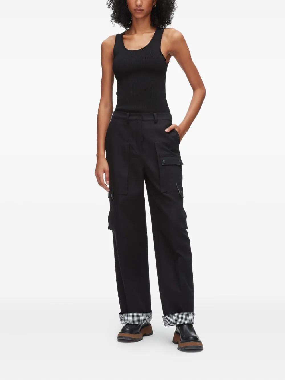 black buttoned flap pockets cuffed hem belt loops zip fastening