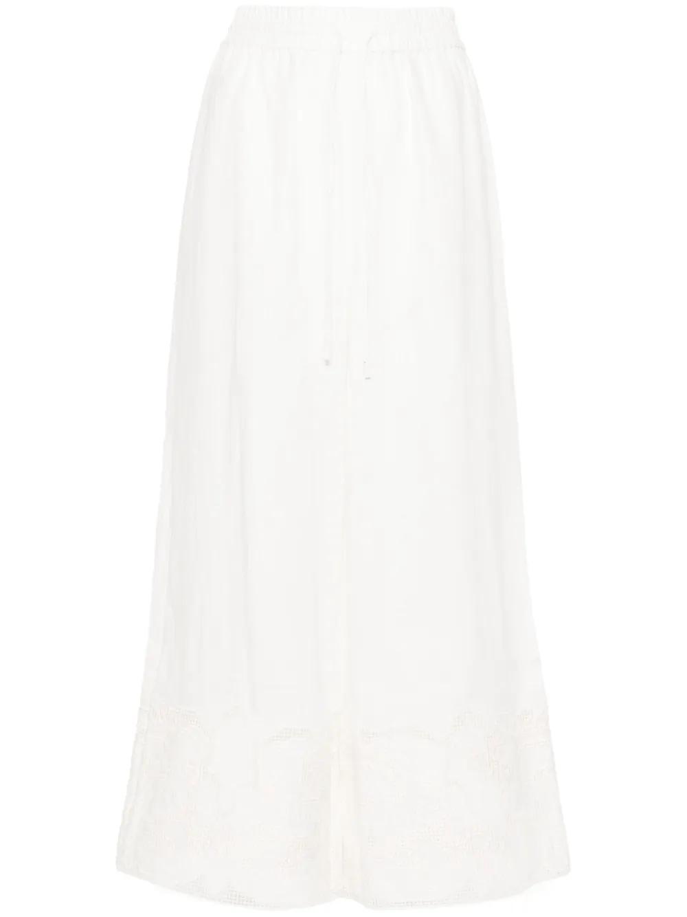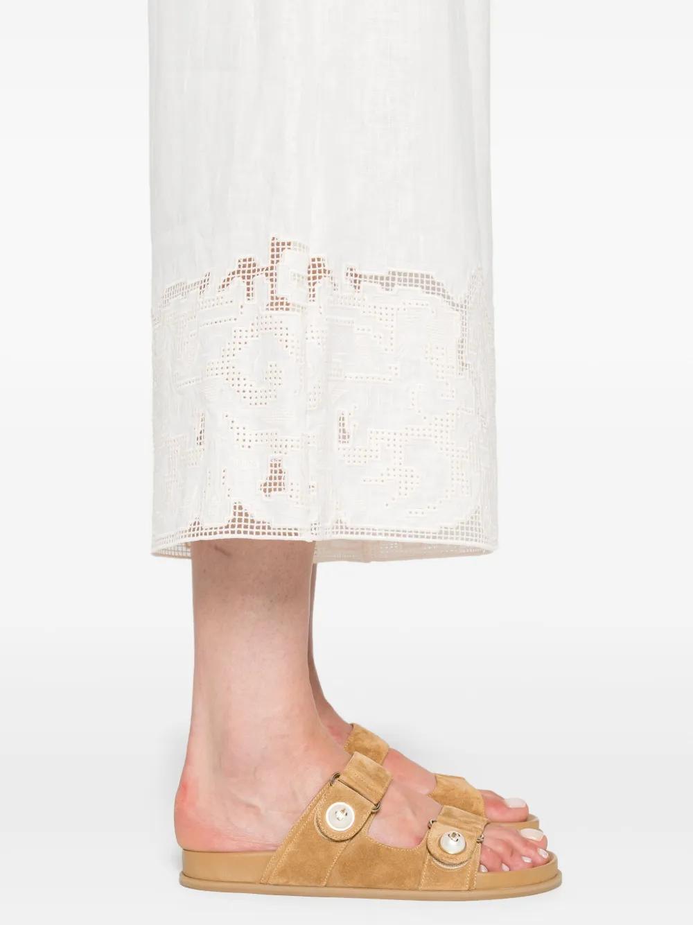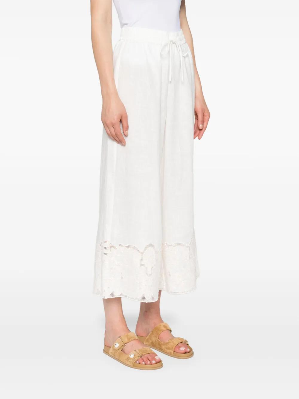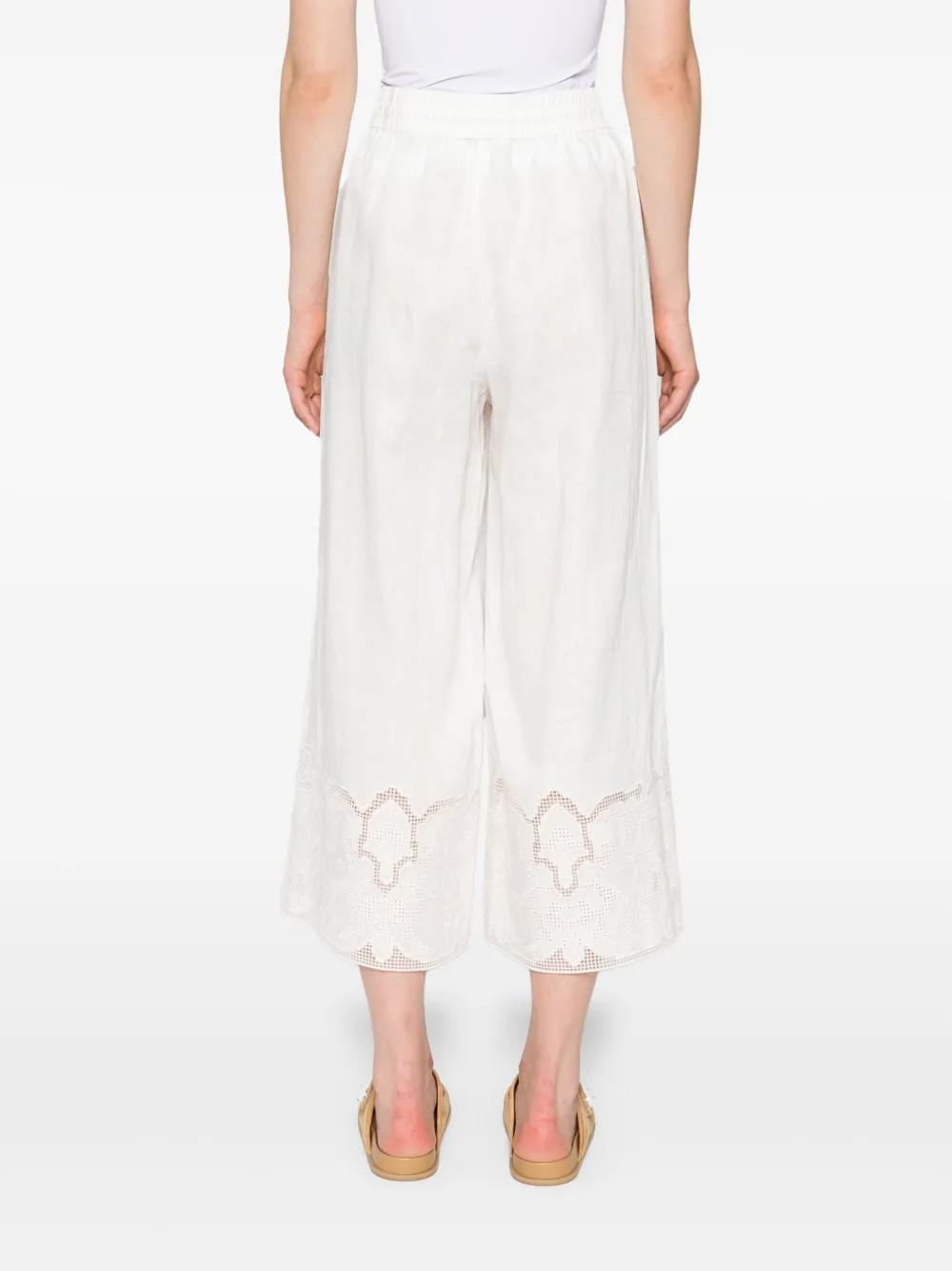 ivory white linen/flax Pegasus embroidered design elasticated drawstring waistband wide leg cropped straight hem