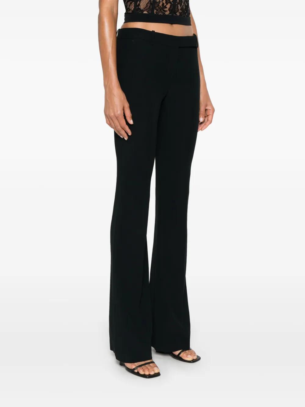 black crepe texture pressed crease mid-rise belt loops concealed front button, hook and zip fastening two side slash pockets rear welt pocket flared leg tailored cut