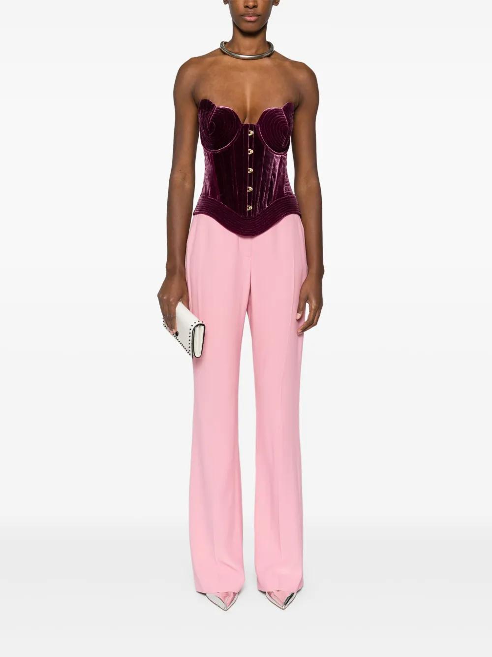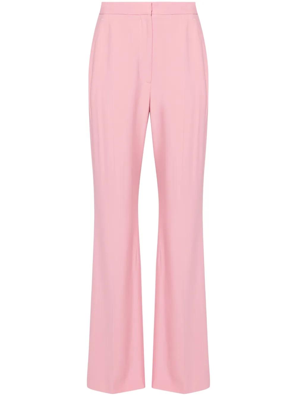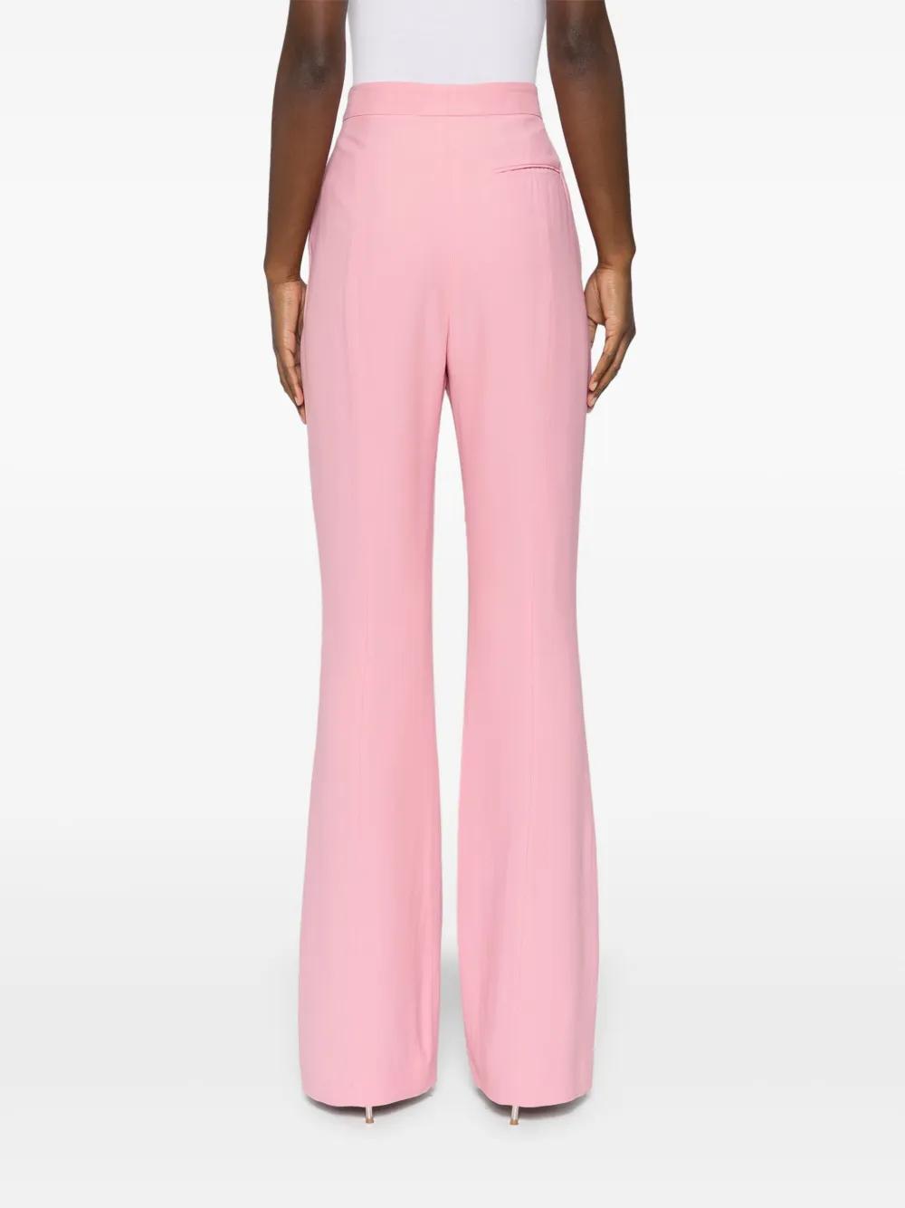 pink textured finish two side slash pockets pressed crease rear jetted pocket flared hem concealed front button, hook and zip fastening