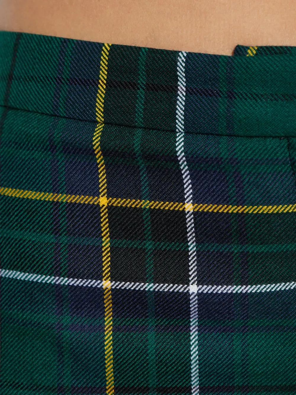 green tartan plaid pattern hook and button zip closure two side pockets wool
