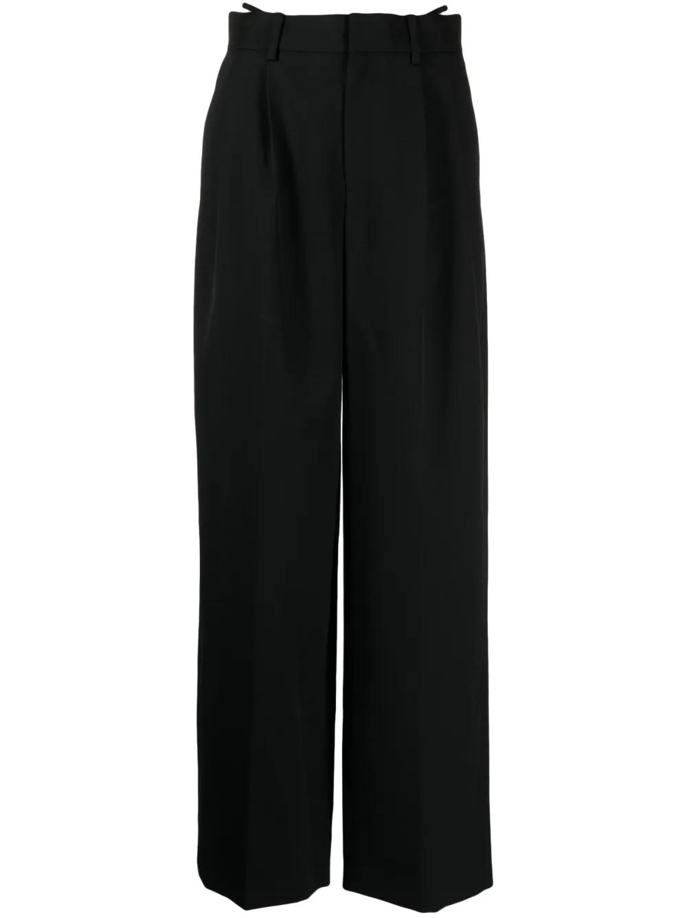 black wool pressed crease silver-tone logo plaque crystal embellishment pleat detailing layered details low-rise wide leg concealed front fastening two side slash pockets two rear welt pockets straight hem