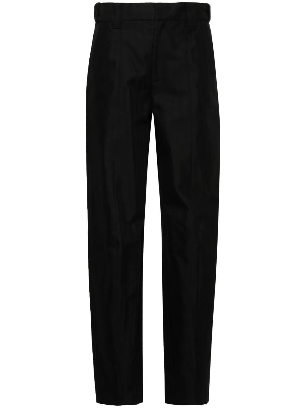 black cotton blend twill weave vertical stripe pattern mid-rise belt loops two diagonal pockets to the sides seam detailing two rear jetted pockets logo patch to the rear internal elasticated strap concealed front button, hook and zip fastening