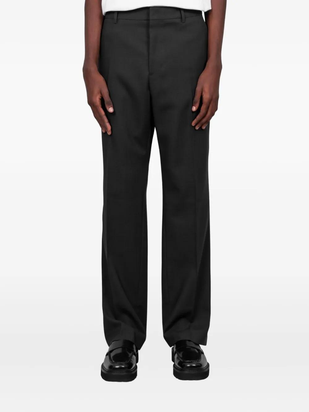 dark grey straight leg belt loops buttoned back pocket side pockets concealed fastening