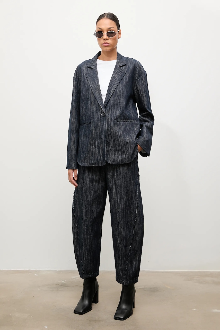 - Spodnie luźne w okolicy bioder i ud. - Luźna nogawka. - Model z podwyższoną talią i zapięciem na suwak i guziki. - Dwie wsuwane kieszenie boczne. - Imitacja kieszeni na pośladkach. - Model z ozdobnymi wystrzępieniami. - Szerokość w pasie: 37,5 cm. - Szerokość w biodrach: 52 cm. - Wysokość stanu: 34 cm. - Szerokość nogawki na dole: 24 cm. - Szerokość nogawki: 32 cm. - Długość zewnętrzna nogawki: 94,5 cm. - Wymiary podane dla rozmiaru: S.
