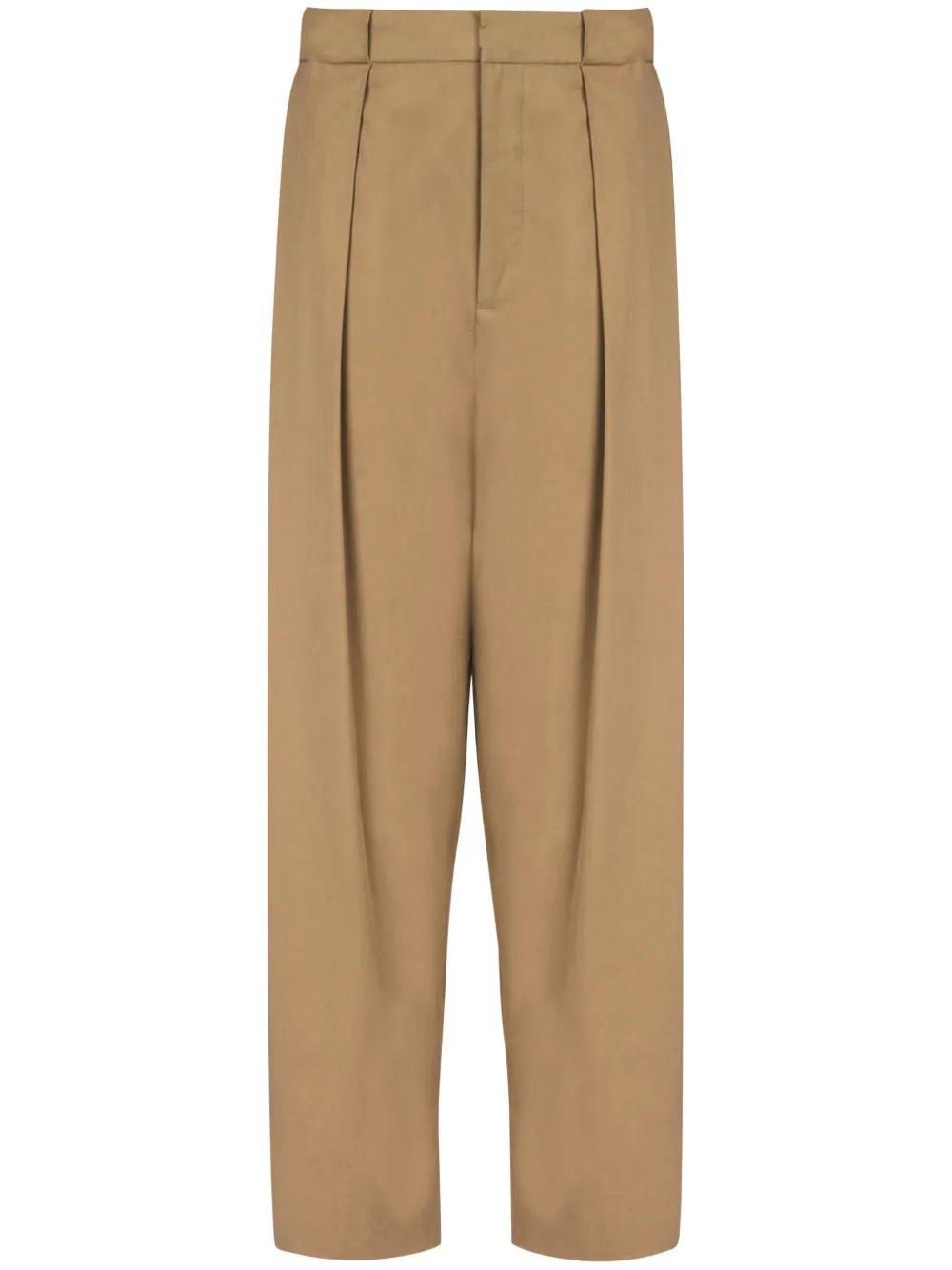 archive beige cotton pleated edge high-rise belt loops hook and zip fly fastening slip pockets to the sides two rear welt pockets